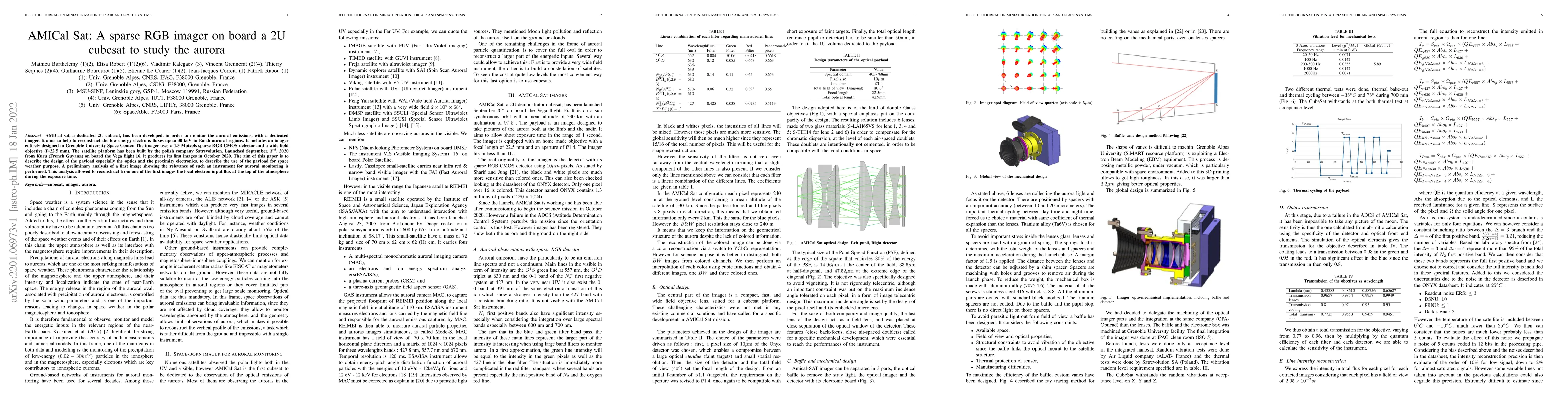 AMICal sat, a dedicated 2U cubesat, has been developed, in order to monitor the auroral emissions, with a dedicated imager. It aims to help to reconstruct the low energy electrons fluxes up to 30 keV in Earth auroral regions. It includes an imager entirely designed in Grenoble University Space Center. The imager uses a 1.3 Mpixels sparse RGB CMOS detector and a wide field objective (f=22.5 mm). The satellite platform has been built by the polish company Satrevolution. Launched September, 3rd, 2020 from Kuru (French Guyana) on board the Vega flight 16, it produces its first images in October 2020. The aim of this paper is to describe the design of the payload especially the optics and the proximity electronics, to describe the use of the payload for space weather purpose. A preliminary analysis of a first image showing the relevance of such an instrument for auroral monitoring is performed. This analysis allowed to reconstruct from one of the first images the local electron input flux at the top of the atmosphere during the exposure time.