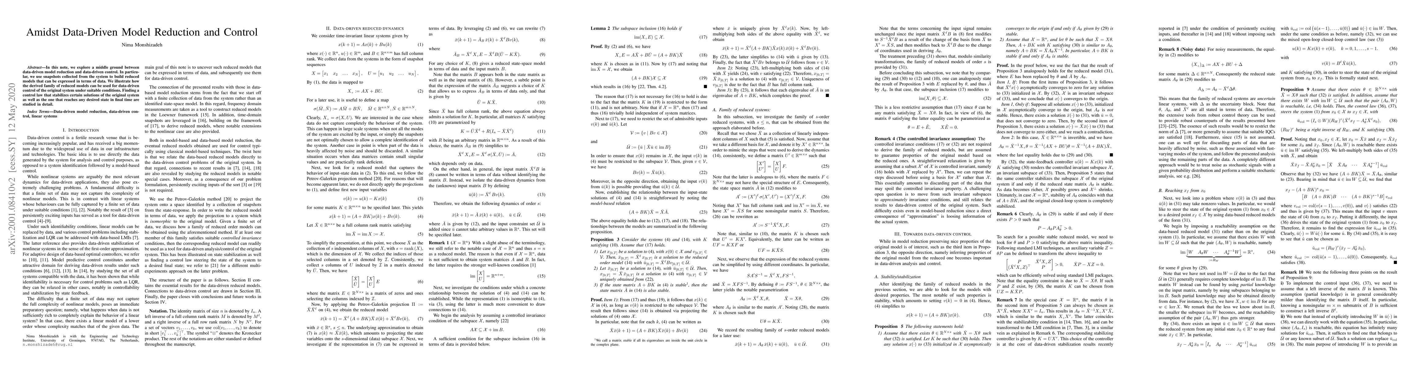 In this note, we explore a middle ground between data-driven model reduction and data-driven control. In particular, we use snapshots collected from the system to build reduced models that can be expressed in terms of data. We illustrate how the derived family of reduced models can be used for data-driven control of the original system under suitable conditions. Finding a control law that stabilizes certain solutions of the original system as well as the one that reaches any desired state in final time are studied in detail.