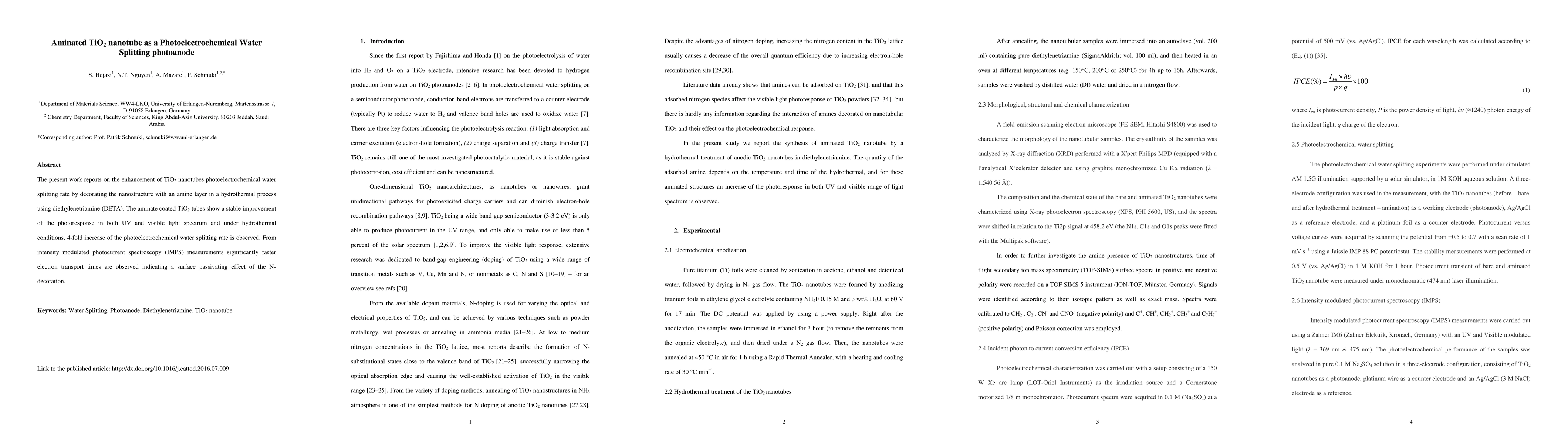 The paper demonstrates the successful enhancement of TiO2 nanotube photoelectrochemical properties through amine decoration via a hydrothermal process, leading to improved water-splitting performance.