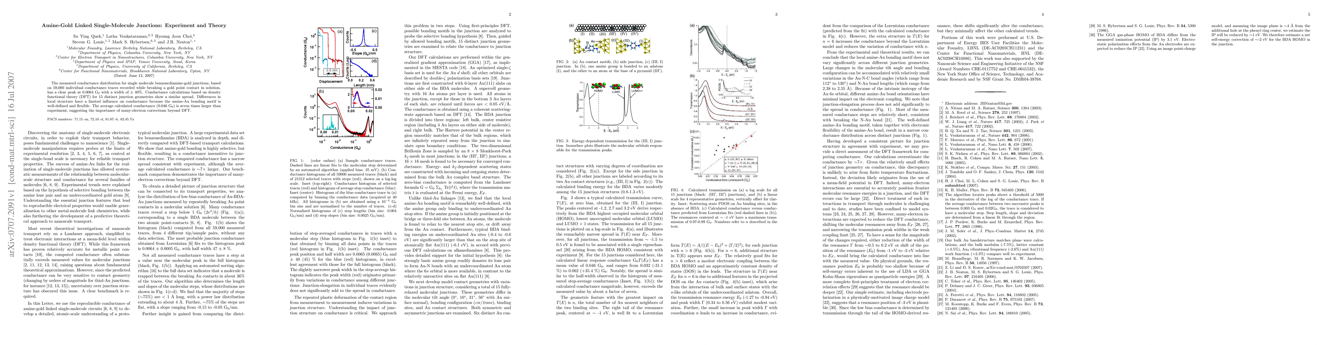 This study investigates the conductance of single-molecule benzenediamine-gold junctions using both experimental and theoretical methods. Experimental data shows a peak conductance at 0.0064 G$_0$ with a 40% width, while DFT calculations predict a similar spread, though with an average conductance seven times higher than observed, indicating the need for many-electron corrections.