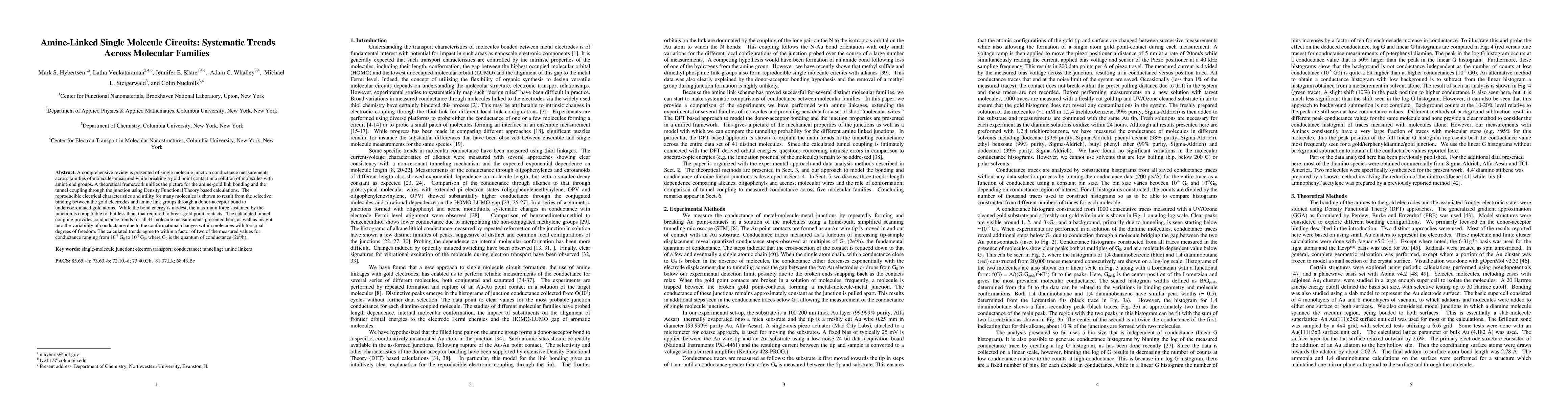 This paper reviews single molecule junction conductance measurements across various amine-linked molecules, revealing systematic trends through a theoretical framework using Density Functional Theory. The study highlights the role of amine-gold bonding and tunnel coupling in determining reproducible electrical characteristics, with calculated conductance trends aligning closely with experimental data.