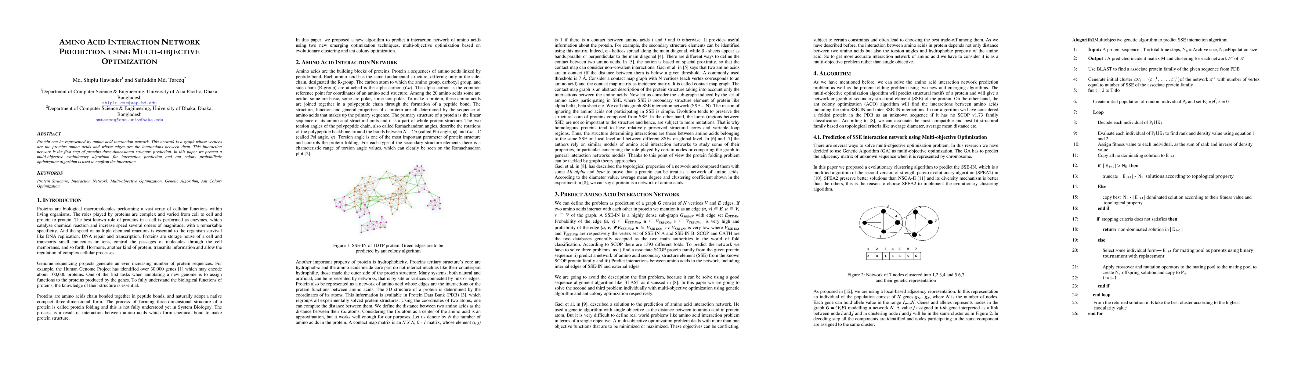 This paper proposes a multi-objective evolutionary algorithm to predict amino acid interaction networks, which are crucial for protein three-dimensional structure prediction, and uses an ant colony probabilistic optimization algorithm to validate the interactions.