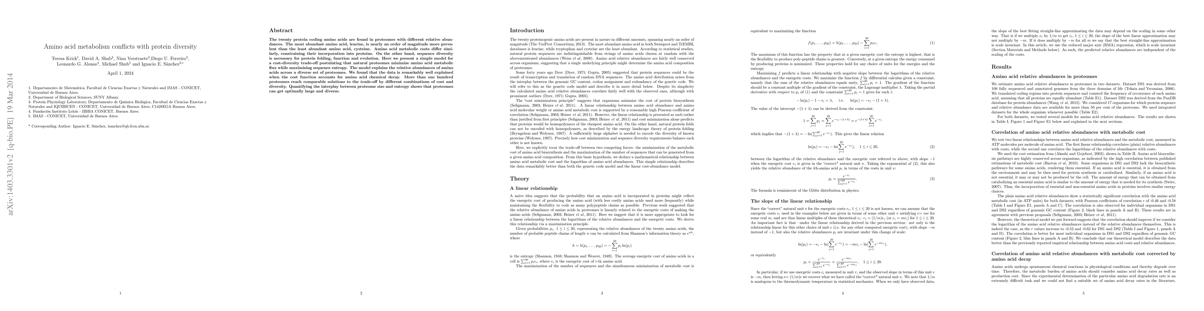 This research paper proposes a model illustrating the trade-off between amino acid metabolic costs and protein sequence diversity, showing that proteomes minimize metabolic flux while maximizing sequence entropy. The model explains the relative abundances of amino acids across various proteomes, highlighting that different proteomes achieve optimal solutions through diverse combinations of cost and diversity.