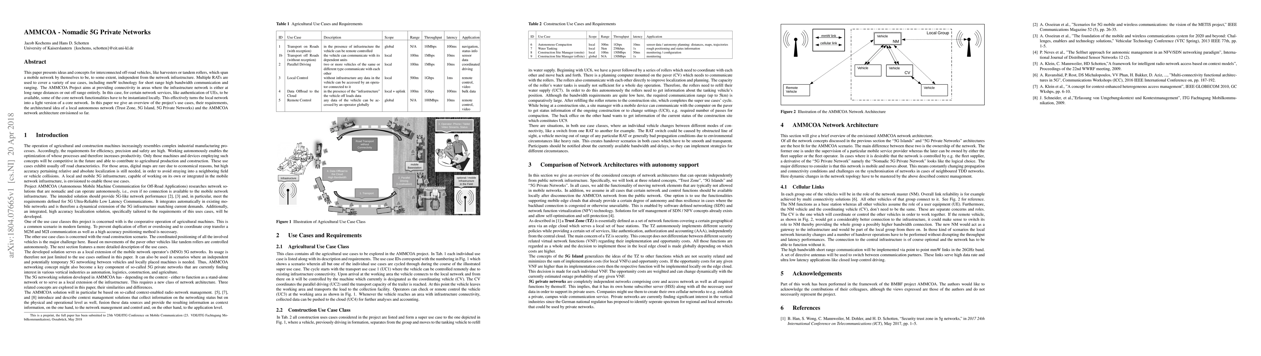 This paper presents ideas and concepts for interconnected off-road vehicles, like harvesters or tandem rollers, which span a mobile network by themselves to be, to some extent, independent from the network infrastructure. Multiple RATs are used to cover a variety of use cases, including mmW technology for short range high bandwidth communication and ranging. The AMMCOA Project aims at providing connectivity in areas where the infrastructure network is either at long range distances or out off range entirely. In this case, for certain network services, like authentication of UEs, to be available, some of the core network functionalities have to be instantiated locally. This effectively turns the local network into a light version of a core network. In this paper we give an overview of the project's use cases, their requirements, the architectural idea of a local autonomous network (Trust Zone, 5G Island, 5G Private Networks) and the AMMCOA network architecture envisioned so far.