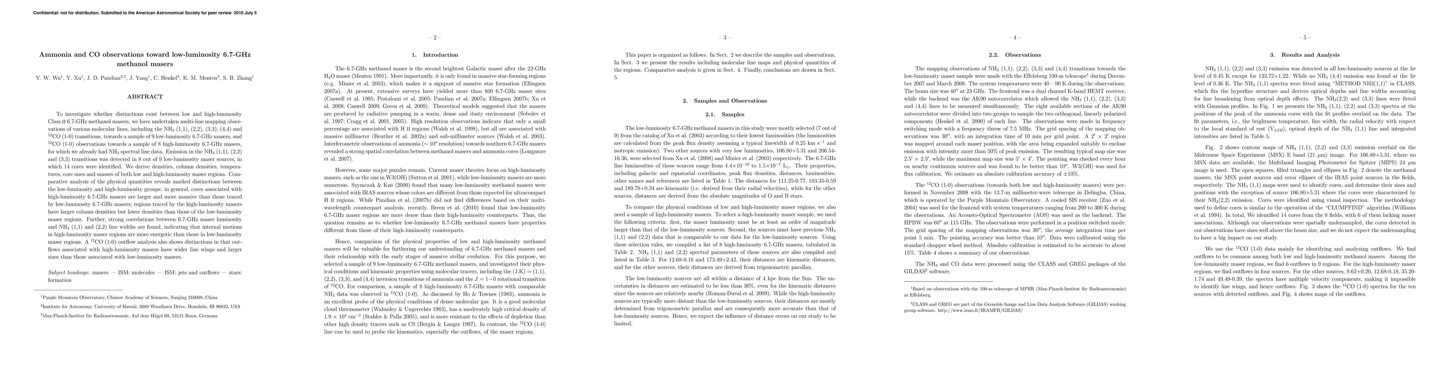 To investigate whether distinctions exist between low and high-luminosity Class II 6.7-GHz methanol masers, we have undertaken multi-line mapping observations of various molecular lines, including the NH3(1,1), (2,2), (3,3), (4,4) and 12CO(1-0) transitions, towards a sample of 9 low-luminosity 6.7-GHz masers, and 12CO (1-0) observations towards a sample of 8 high-luminosity 6.7-GHz masers, for which we already had NH3 spectral line data. Emission in the NH3 (1,1), (2,2) and (3,3) transitions was detected in 8 out of 9 low-luminosity maser sources, in which 14 cores were identified. We derive densities, column densities, temperatures, core sizes and masses of both low and high-luminosity maser regions. Comparative analysis of the physical quantities reveals marked distinctions between the low-luminosity and high-luminosity groups: in general, cores associated with high-luminosity 6.7-GHz masers are larger and more massive than those traced by low-luminosity 6.7-GHz masers; regions traced by the high-luminosity masers have larger column densities but lower densities than those of the low-luminosity maser regions. Further, strong correlations between 6.7-GHz maser luminosity and NH3(1,1) and (2,2) line widths are found, indicating that internal motions in high-luminosity maser regions are more energetic than those in low-luminosity maser regions. A 12CO (1-0) outflow analysis also shows distinctions in that outflows associated with high-luminosity masers have wider line wings and larger sizes than those associated with low-luminosity masers.