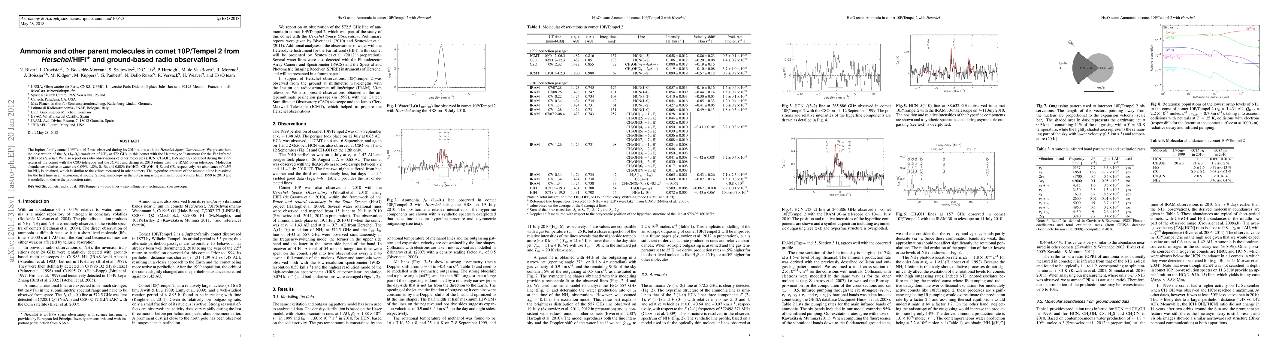 The Jupiter-family comet 10P/Tempel 2 was observed during its 2010 return with the Herschel Space Observatory. We present here the observation of the (J, K) = (1, 0)-(0, 0) transition of ammonia at 572 GHz in this comet with the Heterodyne Instrument for the Far Infrared (HIFI) of Herschel. We also report on radio observations of other molecules (HCN, CH3OH, H2S and CS) obtained during the 1999 return of the comet with the CSO telescope and the JCMT, and during its 2010 return with the IRAM 30-m telescope. Molecular abundances relative to water are 0.09%, 1.8%, 0.4%, and 0.08% for HCN, CH3OH, H2S, and CS, respectively. An abundance of 0.5% for NH3 is obtained, which is similar to the values measured in other comets. The hyperfine structure of the ammonia line is resolved for the first time in an astronomical source. Strong anisotropy in the outgassing is present in all observations from 1999 to 2010 and is modelled to derive the production rates.