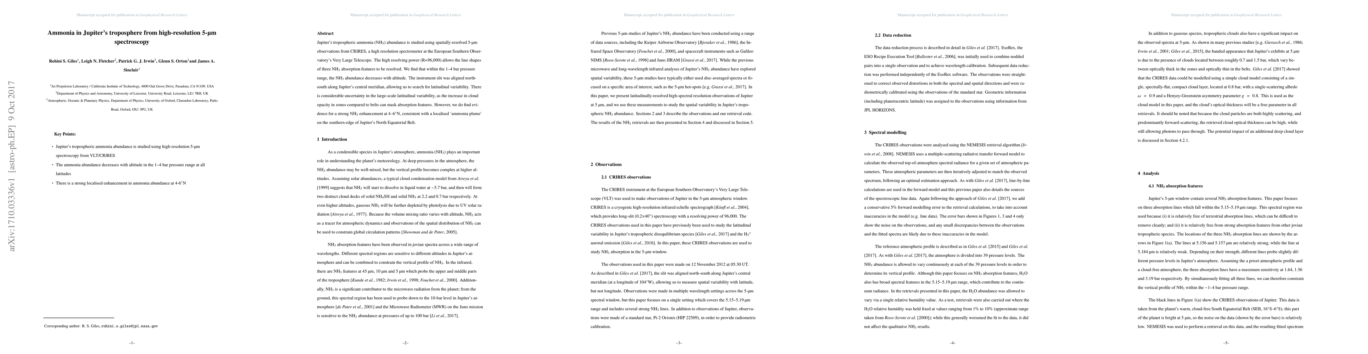 This study uses high-resolution 5-micron spectroscopy from CRIRES at ESO's Very Large Telescope to analyze Jupiter's tropospheric ammonia (NH3) abundance. Findings reveal NH3 decreases with altitude in the 1-4 bar pressure range and identify a strong ammonia enhancement, or 'plume', at 4-6°N near Jupiter's South Equatorial Belt.
