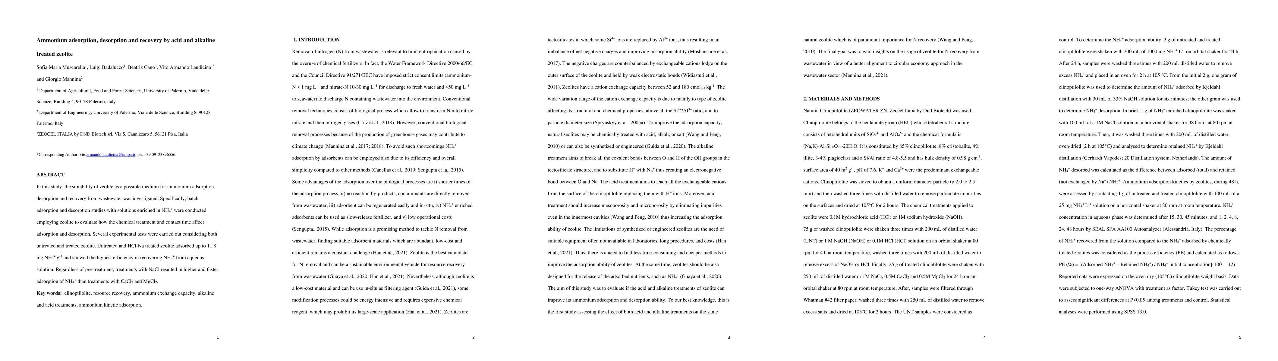 In this study, the suitability of zeolite as a possible medium for ammonium adsorption, desorption and recovery from wastewater was investigated. Specifically, batch adsorption and desorption studies with solutions enriched in NH$_4^+$ were conducted employing zeolite to evaluate how the chemical treatment and contact time affect adsorption and desorption. Several experimental tests were carried out considering both untreated and treated zeolite. Untreated and HCl-Na treated zeolite adsorbed up to 11.8 mg NH$_4^+$ g$^{-1}$ and showed the highest efficiency in recovering NH$_4^+$ from aqueous solution. Regardless of pre-treatment, treatments with NaCl resulted in higher and faster adsorption of NH$_4^+$ than treatments with CaCl$_2$ and MgCl$_2$.