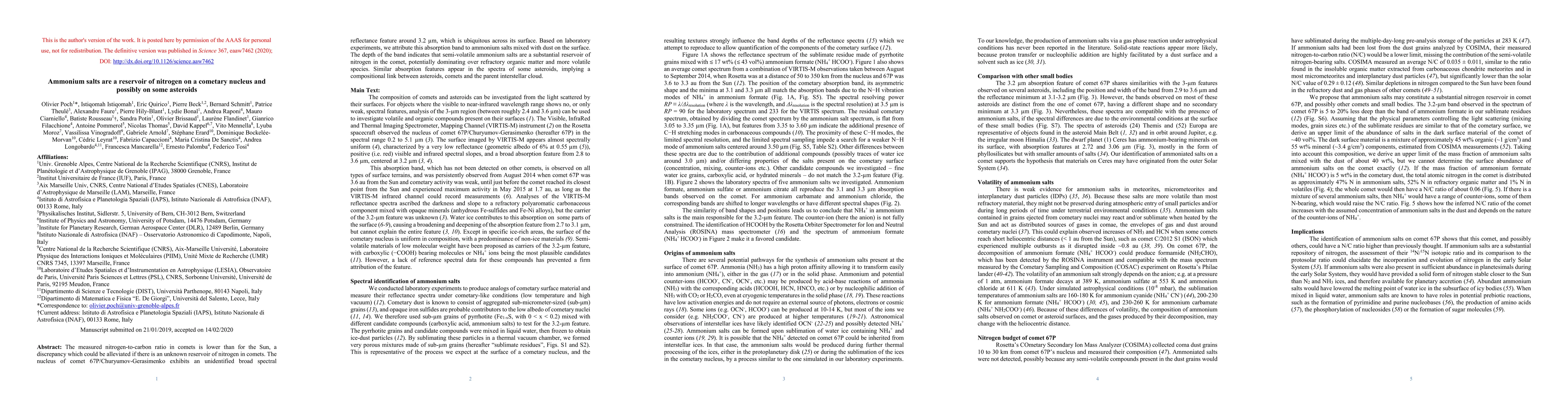 This study identifies ammonium salts as a significant nitrogen reservoir on the nucleus of comet 67P/Churyumov-Gerasimenko, potentially explaining the lower nitrogen-to-carbon ratio in comets compared to the Sun. These salts may also be present in some asteroids, suggesting a shared compositional history.