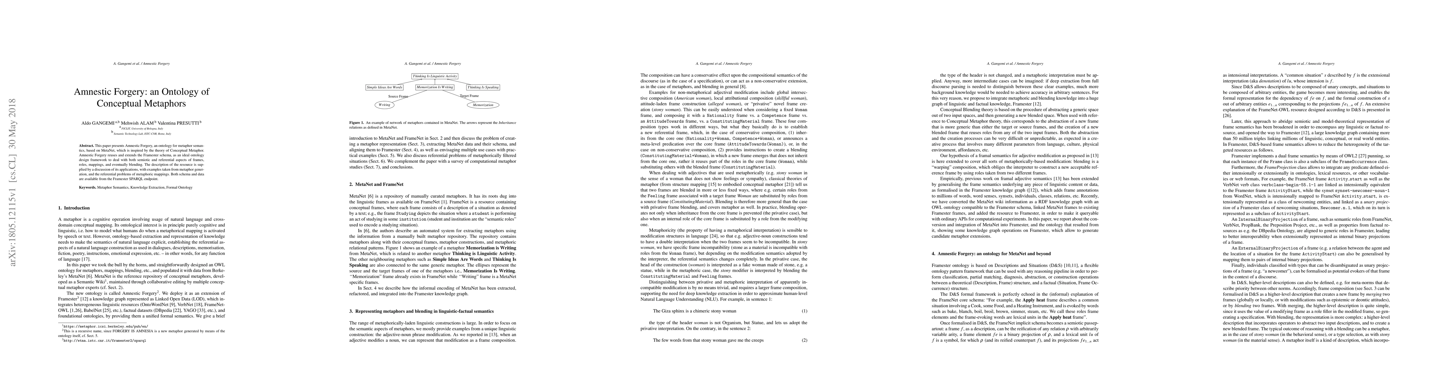 This paper introduces Amnestic Forgery, an ontology for metaphor semantics based on MetaNet, extending the Framester schema to address both semiotic and referential aspects of metaphoric mappings, with applications in metaphor generation and referential problems. The ontology and its data are accessible via the Framester SPARQL endpoint.