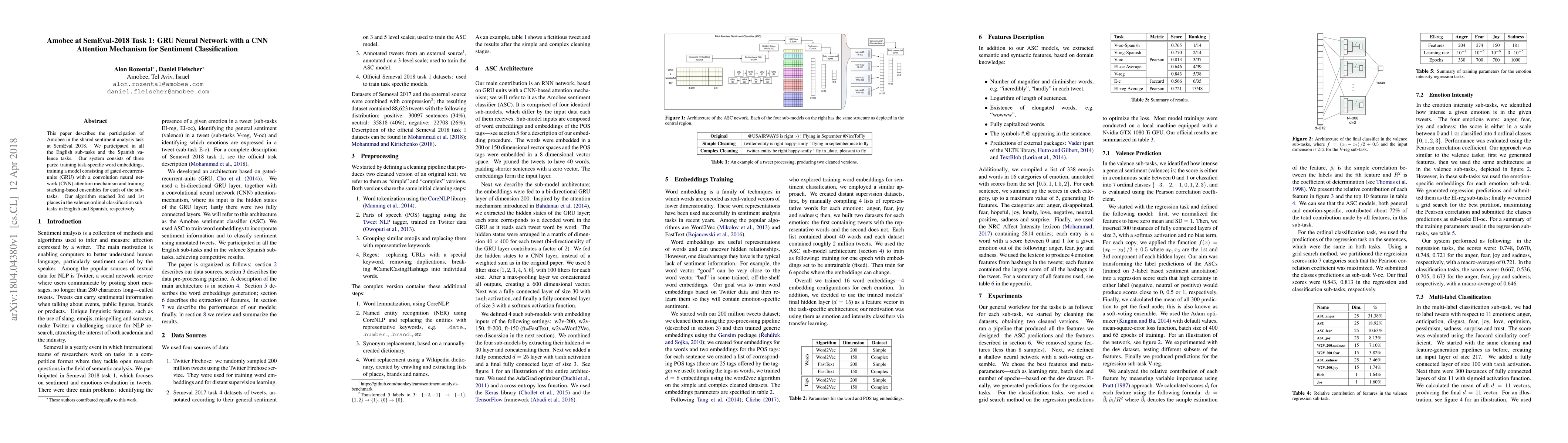 Summary: Amobee utilized a GRU neural network with a CNN attention mechanism for sentiment classification in SemEval 2018, achieving top ranks in English and Spanish valence ordinal classification sub-tasks through task-specific embeddings and ensemble stacking.