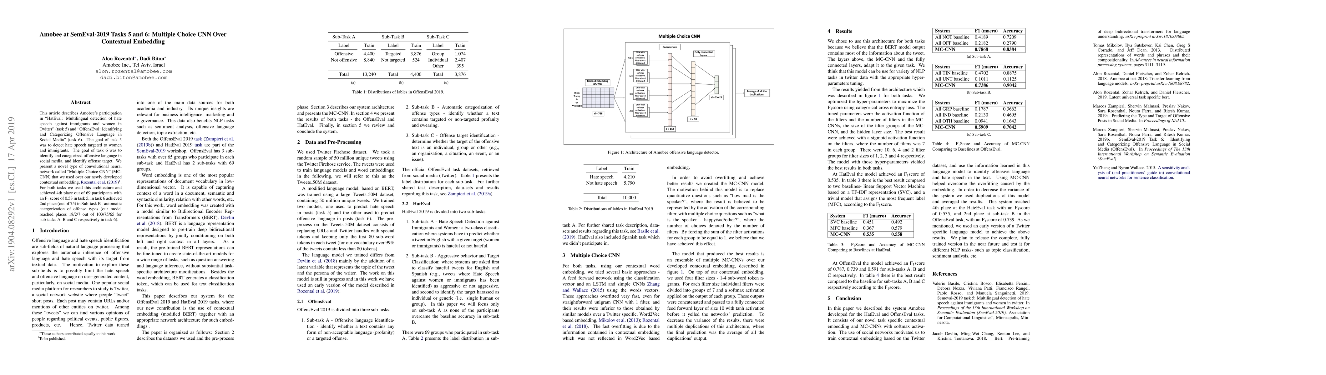 This article describes Amobee's participation in "HatEval: Multilingual detection of hate speech against immigrants and women in Twitter" (task 5) and "OffensEval: Identifying and Categorizing Offensive Language in Social Media" (task 6). The goal of task 5 was to detect hate speech targeted to women and immigrants. The goal of task 6 was to identify and categorized offensive language in social media, and identify offense target. We present a novel type of convolutional neural network called "Multiple Choice CNN" (MC-CNN) that we used over our newly developed contextual embedding, Rozental et al. (2019). For both tasks we used this architecture and achieved 4th place out of 69 participants with an F1 score of 0.53 in task 5, in task 6 achieved 2nd place (out of 75) in Sub-task B - automatic categorization of offense types (our model reached places 18/2/7 out of 103/75/65 for sub-tasks A, B and C respectively in task 6).