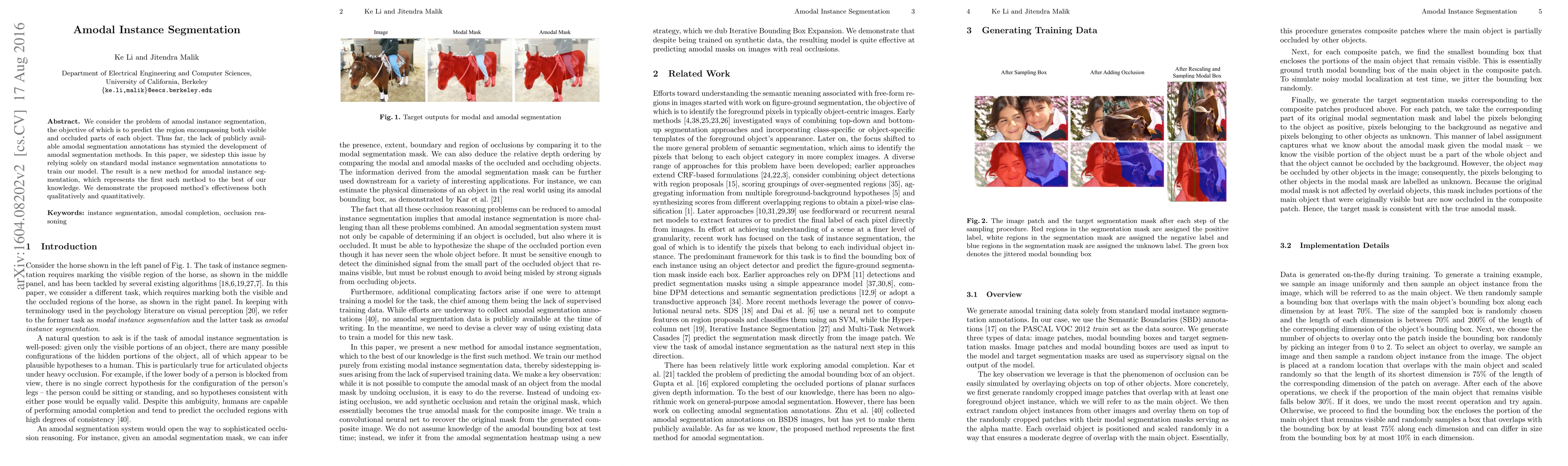 This paper introduces a novel method for amodal instance segmentation using standard modal instance segmentation annotations, addressing the lack of available amodal segmentation data. The proposed method is demonstrated to be effective through both qualitative and quantitative evaluations.