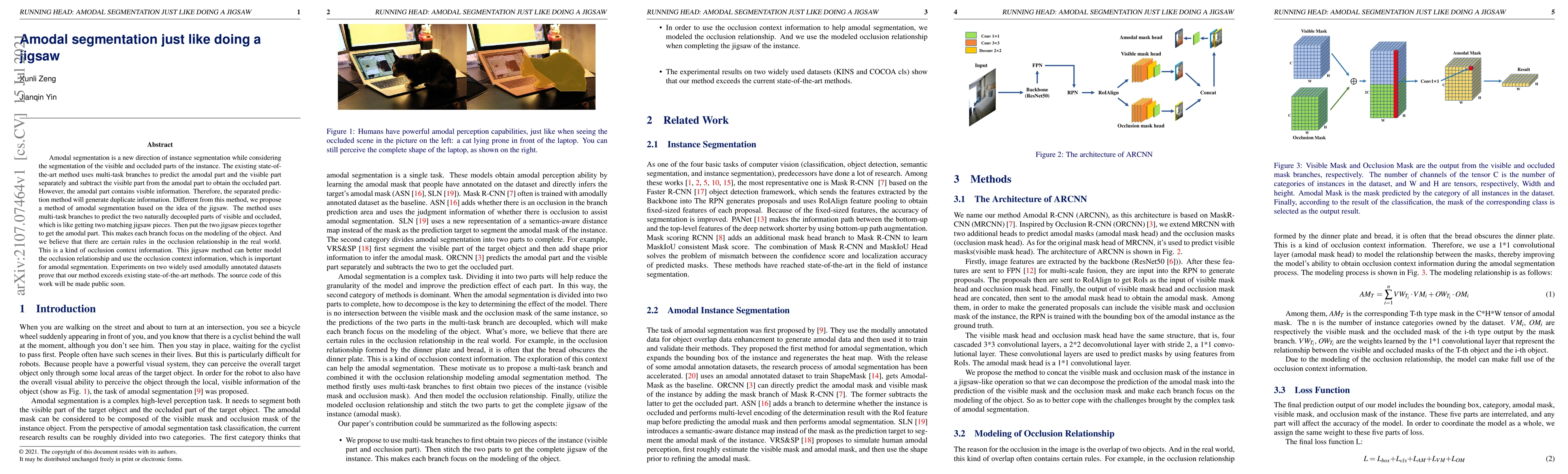 This paper proposes a novel amodal segmentation method inspired by the jigsaw puzzle concept, which predicts visible and occluded parts separately to avoid duplicate information. The method leverages occlusion context information to better model occlusion relationships, outperforming existing state-of-the-art methods on benchmark datasets.