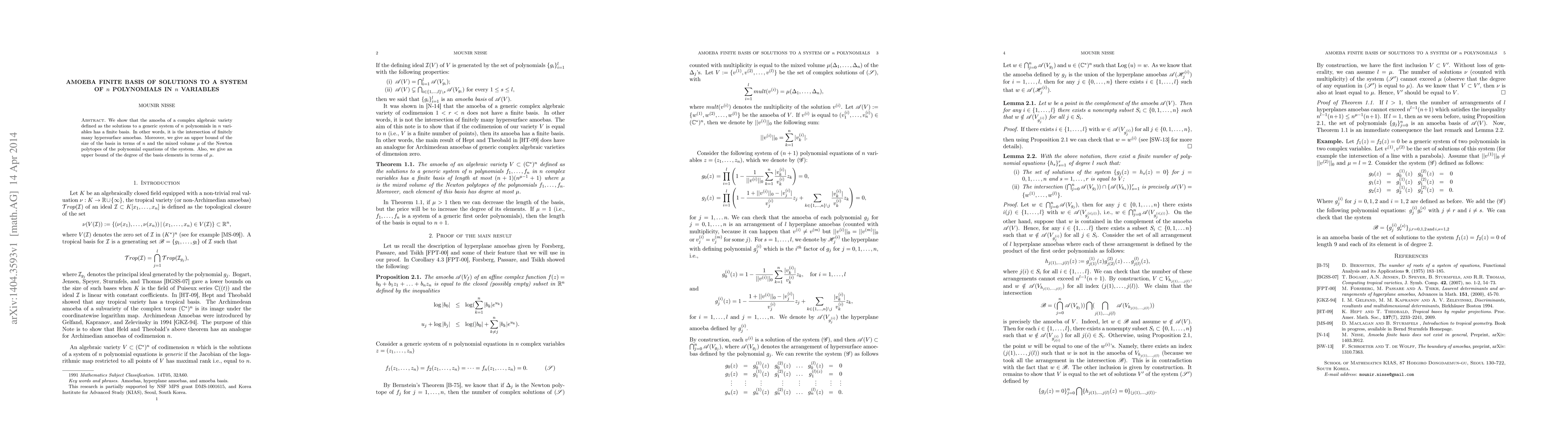We show that the amoeba of a complex algebraic variety defined as the solutions to a generic system of $n$ polynomials in $n$ variables has a finite basis. In other words, it is the intersection of finitely many hypersurface amoebas. Moreover, we give an upper bound of the size of the basis in terms of $n$ and the mixed volume $\mu$ of the Newton polytopes of the polynomial equations of the system. Also, we give an upper bound of the degree of the basis elements in terms of $\mu$.