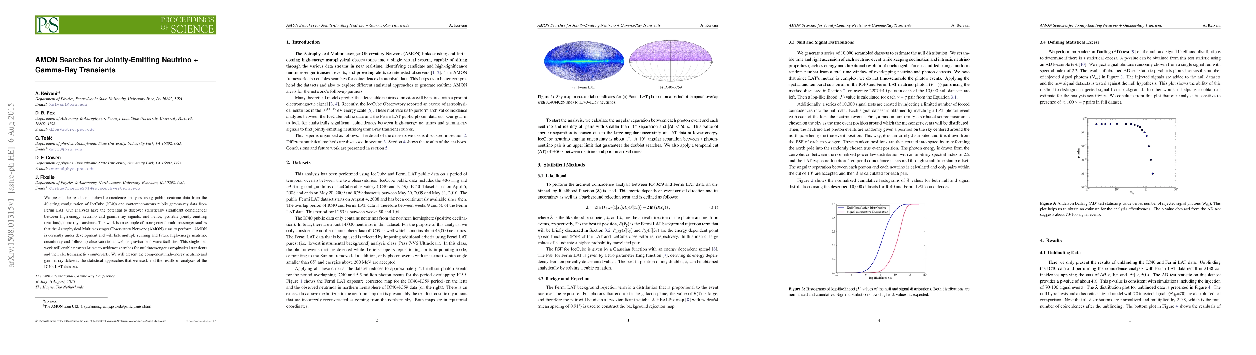 We present the results of archival coincidence analyses using public neutrino data from the 40-string configuration of IceCube (IC40) and contemporaneous public gamma-ray data from Fermi LAT. Our analyses have the potential to discover statistically significant coincidences between high-energy neutrino and gamma-ray signals, and hence, possible jointly-emitting neutrino/gamma-ray transients. This work is an example of more general multimessenger studies that the Astrophysical Multimessenger Observatory Network (AMON) aims to perform. AMON is currently under development and will link multiple running and future high-energy neutrino, cosmic ray and follow-up observatories as well as gravitational wave facilities. This single network will enable near real-time coincidence searches for multimessenger astrophysical transients and their electromagnetic counterparts. We will present the component high-energy neutrino and gamma-ray datasets, the statistical approaches that we used, and the results of analyses of the IC40+LAT datasets.