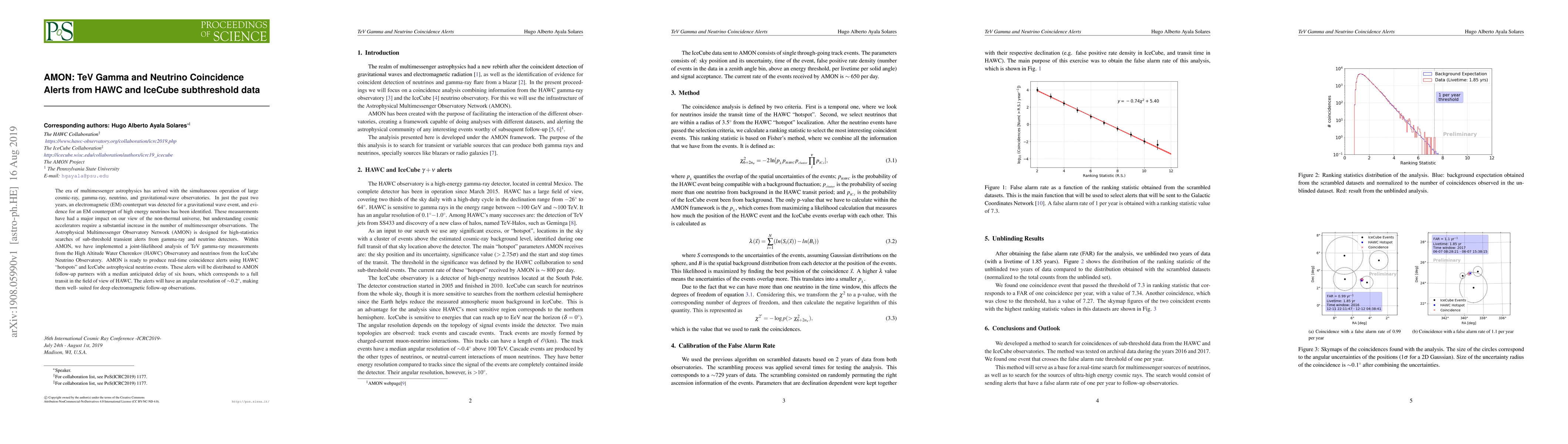 The Astrophysical Multimessenger Observatory Network (AMON) facilitates real-time alerts for TeV gamma-ray hotspots from HAWC and neutrino events from IceCube, aiming to enhance multimessenger observations and follow-up studies. Alerts are distributed with a six-hour delay and ${\sim}0.2^{\circ}$ angular resolution, optimizing electromagnetic counterpart detection.