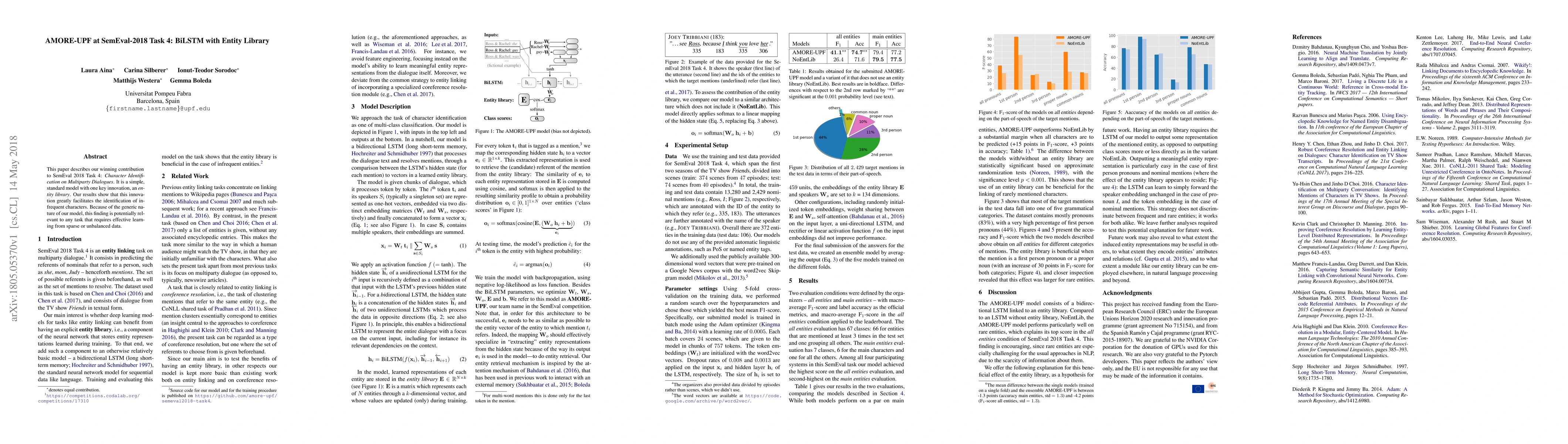 This paper describes our winning contribution to SemEval 2018 Task 4: Character Identification on Multiparty Dialogues. It is a simple, standard model with one key innovation, an entity library. Our results show that this innovation greatly facilitates the identification of infrequent characters. Because of the generic nature of our model, this finding is potentially relevant to any task that requires effective learning from sparse or unbalanced data.