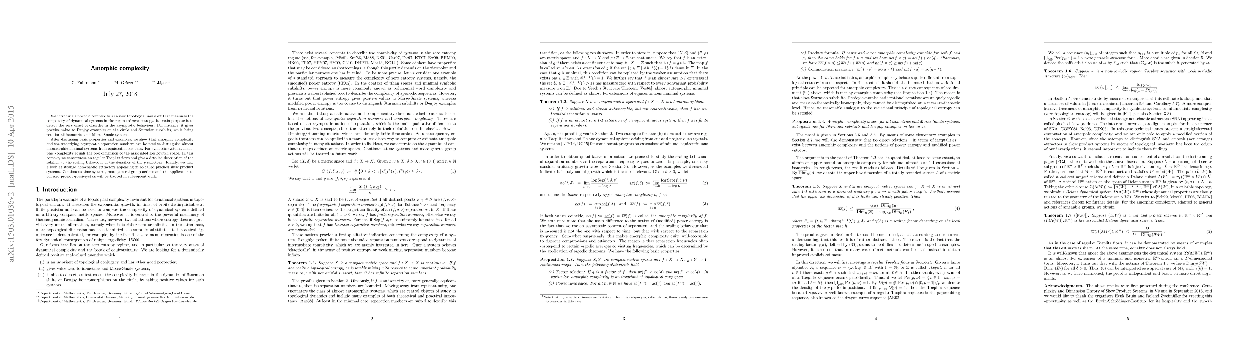We introduce amorphic complexity as a new topological invariant that measures the complexity of dynamical systems in the regime of zero entropy. Its main purpose is to detect the very onset of disorder in the asymptotic behaviour. For instance, it gives positive value to Denjoy examples on the circle and Sturmian subshifts, while being zero for all isometries and Morse-Smale systems. After discussing basic properties and examples, we show that amorphic complexity and the underlying asymptotic separation numbers can be used to distinguish almost automorphic minimal systems from equicontinuous ones. For symbolic systems, amorphic complexity equals the box dimension of the associated Besicovitch space. In this context, we concentrate on regular Toeplitz flows and give a detailed description of the relation to the scaling behaviour of the densities of the p-skeletons. Finally, we take a look at strange non-chaotic attractors appearing in so-called pinched skew product systems. Continuous-time systems, more general group actions and the application to cut and project quasicrystals will be treated in subsequent work.