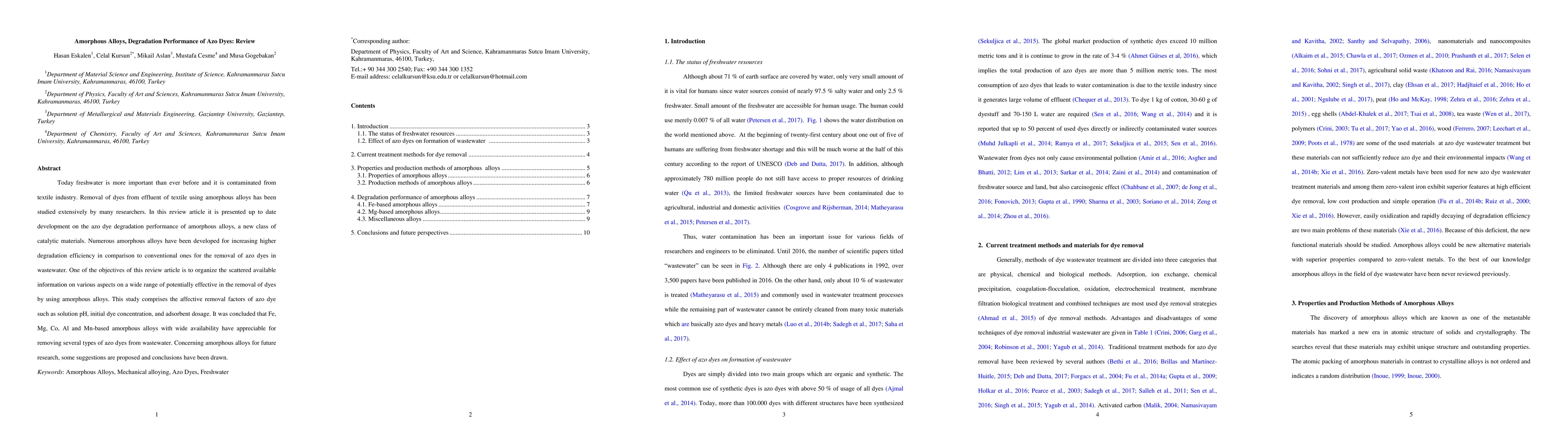 This review examines the degradation performance of azo dyes using amorphous alloys, highlighting their effectiveness compared to conventional materials. It synthesizes current knowledge on factors like pH, dye concentration, and alloy dosage, concluding that Fe, Mg, Co, Al, and Mn-based alloys are promising for wastewater dye removal.