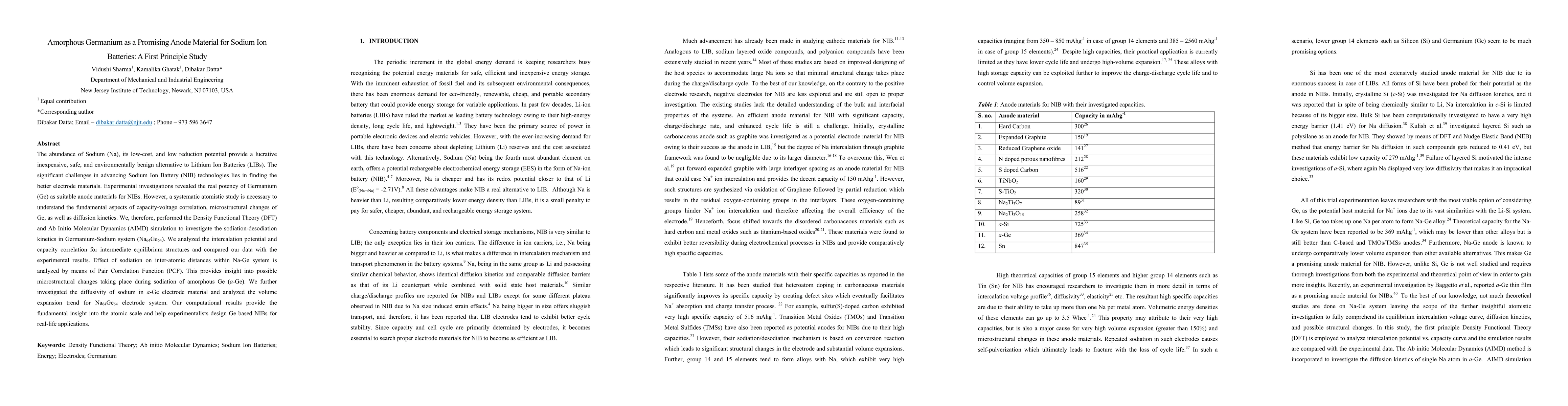 This study employs Density Functional Theory and Ab Initio Molecular Dynamics simulations to explore amorphous germanium's potential as an anode material for sodium ion batteries. The research provides fundamental insights into the sodiation-desodiation kinetics, intercalation potential, and microstructural changes in the Na-Ge system, highlighting germanium's viability for advanced sodium ion battery technologies.