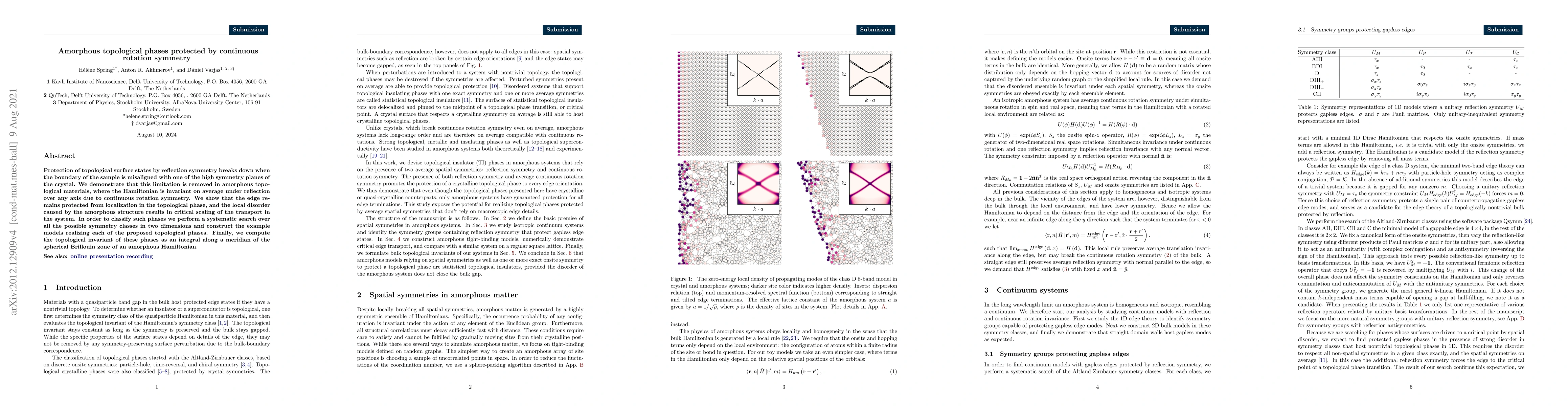 Protection of topological surface states by reflection symmetry breaks down when the boundary of the sample is misaligned with one of the high symmetry planes of the crystal. We demonstrate that this limitation is removed in amorphous topological materials, where the Hamiltonian is invariant on average under reflection over any axis due to continuous rotation symmetry. While the local disorder caused by the amorphous structure weakens the topological protection, we demonstrate that the edge remains protected from localization. In order to classify such phases we perform a systematic search over all the possible symmetry classes in two dimensions and construct the example models realizing each of the proposed topological phases. Finally, we compute the topological invariant of these phases as an integral along a meridian of the spherical Brillouin zone of an amorphous Hamiltonian.
