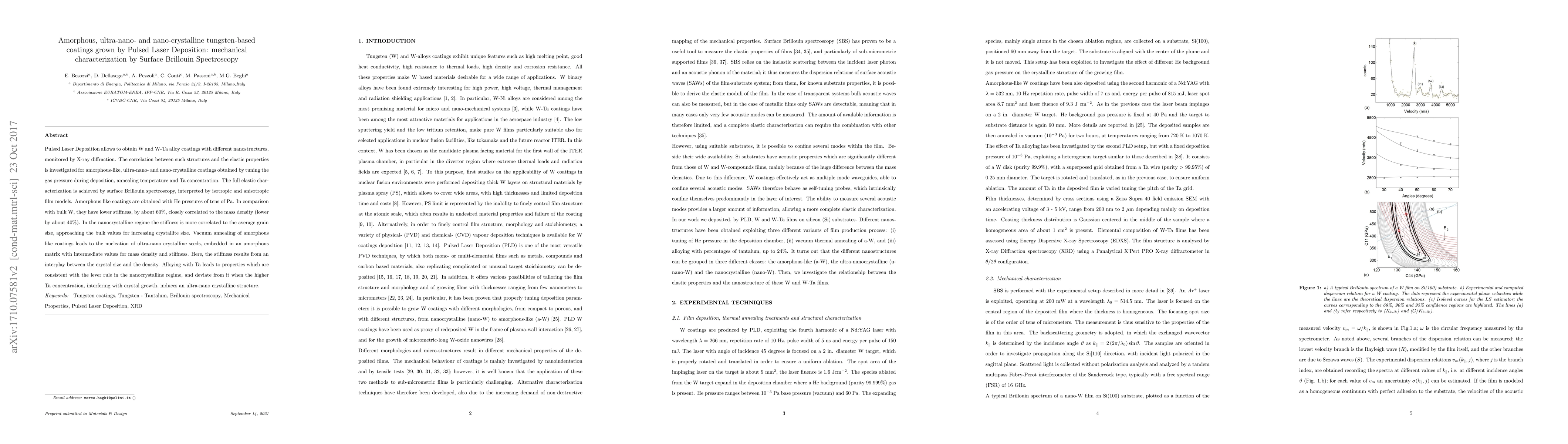 This paper investigates tungsten-based coatings with varying nanostructures grown via Pulsed Laser Deposition, correlating their mechanical properties to structure. Surface Brillouin spectroscopy reveals that amorphous coatings have lower stiffness and density compared to bulk tungsten, while nanocrystalline coatings' stiffness correlates with grain size.