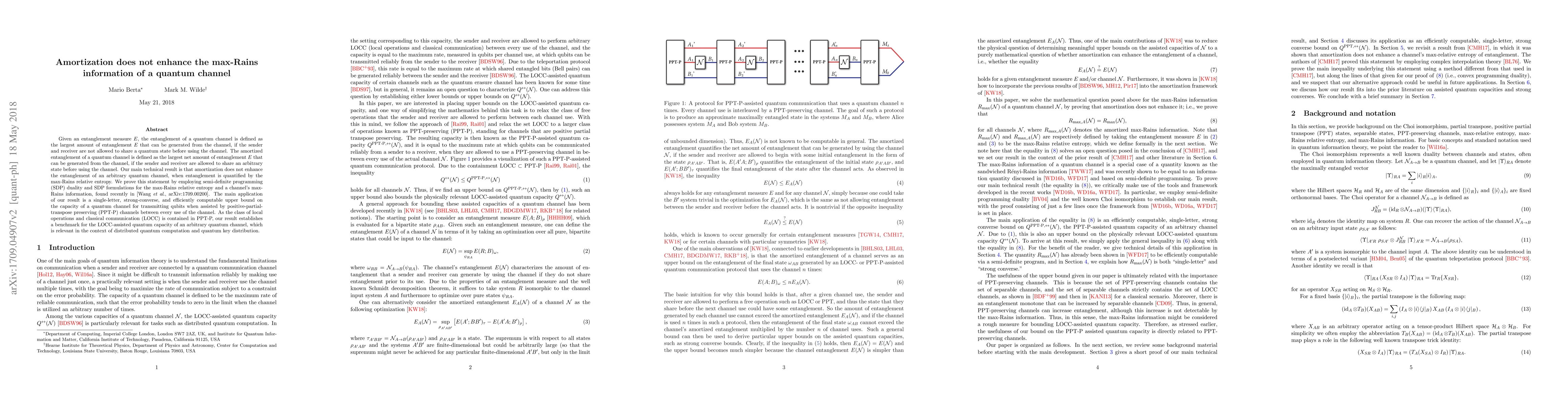 Given an entanglement measure $E$, the entanglement of a quantum channel is defined as the largest amount of entanglement $E$ that can be generated from the channel, if the sender and receiver are not allowed to share a quantum state before using the channel. The amortized entanglement of a quantum channel is defined as the largest net amount of entanglement $E$ that can be generated from the channel, if the sender and receiver are allowed to share an arbitrary state before using the channel. Our main technical result is that amortization does not enhance the entanglement of an arbitrary quantum channel, when entanglement is quantified by the max-Rains relative entropy. We prove this statement by employing semi-definite programming (SDP) duality and SDP formulations for the max-Rains relative entropy and a channel's max-Rains information, found recently in [Wang et al., arXiv:1709.00200]. The main application of our result is a single-letter, strong-converse, and efficiently computable upper bound on the capacity of a quantum channel for transmitting qubits when assisted by positive-partial-transpose preserving (PPT-P) channels between every use of the channel. As the class of local operations and classical communication (LOCC) is contained in PPT-P, our result establishes a benchmark for the LOCC-assisted quantum capacity of an arbitrary quantum channel, which is relevant in the context of distributed quantum computation and quantum key distribution.