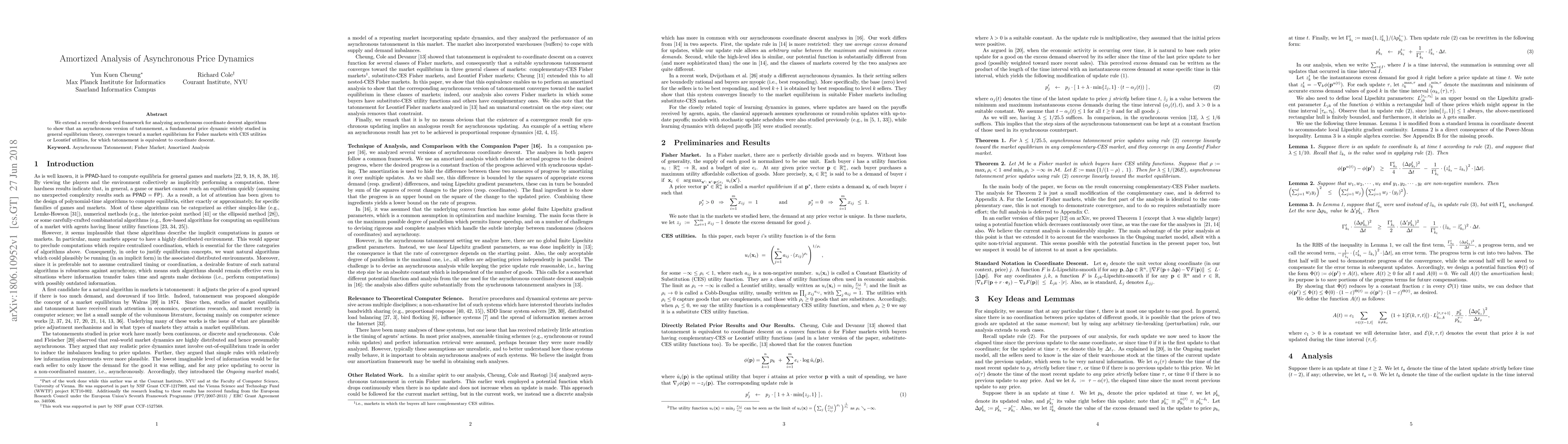 Summary: This paper extends asynchronous coordinate descent analysis to demonstrate that an asynchronous version of tatonnement converges to market equilibrium in Fisher markets with CES or Leontief utilities, leveraging the equivalence of tatonnement to coordinate descent. The study employs amortized analysis techniques to achieve this convergence.
