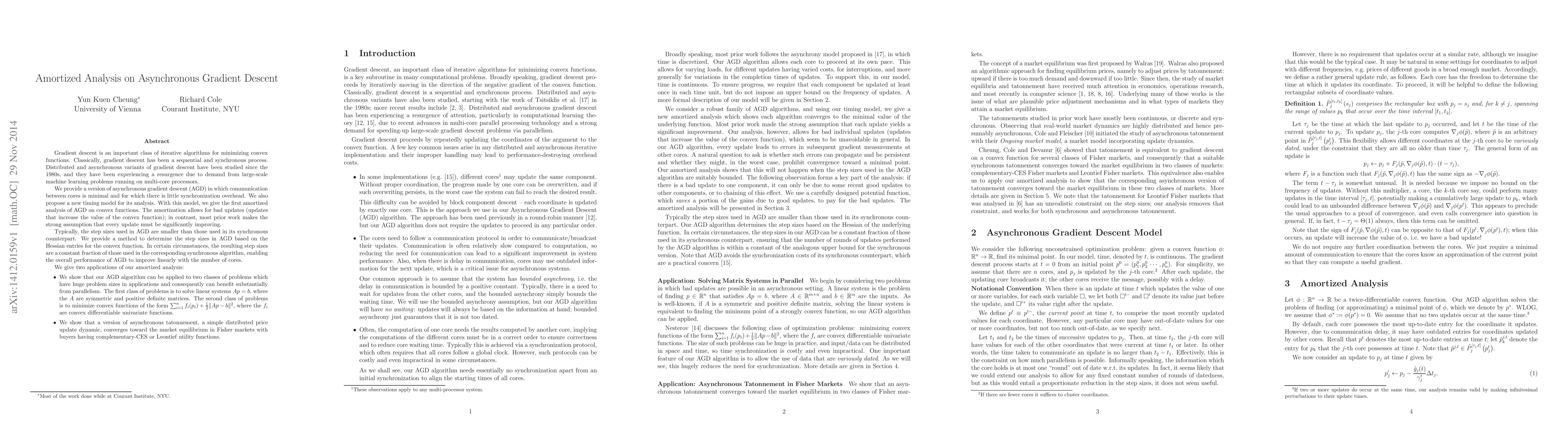 This paper presents an asynchronous gradient descent (AGD) algorithm with minimal communication and synchronization overhead, along with an amortized analysis that accommodates bad updates. It also proposes a method to determine optimal step sizes based on Hessian entries, potentially improving AGD performance linearly with the number of cores.