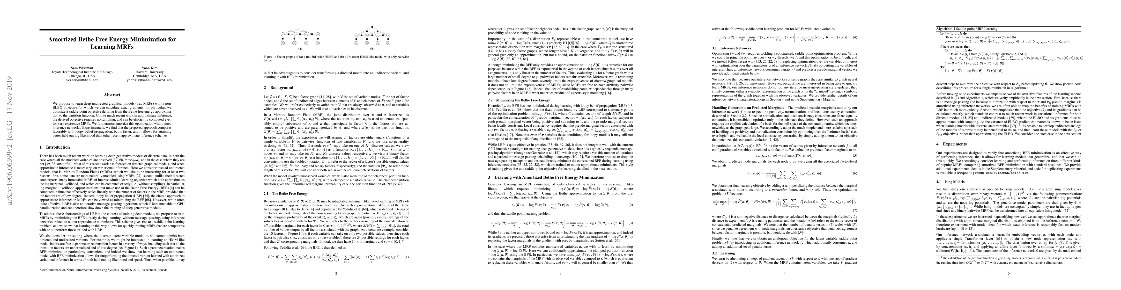 This paper proposes a method to learn deep undirected graphical models using a non-ELBO objective based on the Bethe free energy approximation, which allows for exact gradient calculation and efficient computation without sampling. The approach employs amortized optimization with inference networks, demonstrating faster performance and better log likelihood compared to loopy belief propagation.