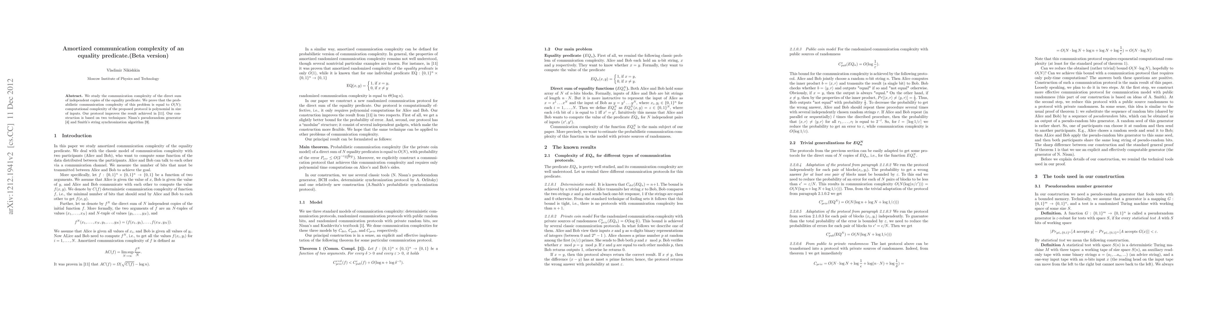 We study the communication complexity of a direct sum of independent copies of the equality predicate. We prove that the probabilistic communication complexity of this problem is equal to O(N); computational complexity of the proposed protocol is polynomial in size of inputs. Our protocol improves the result achieved in 1995(Feder, Kushilevitz, Naor, Nisan). Our construction is based on two techniques: Nisan's pseudorandom generator (1992) and Smith's string synchronization algorithm (2007).