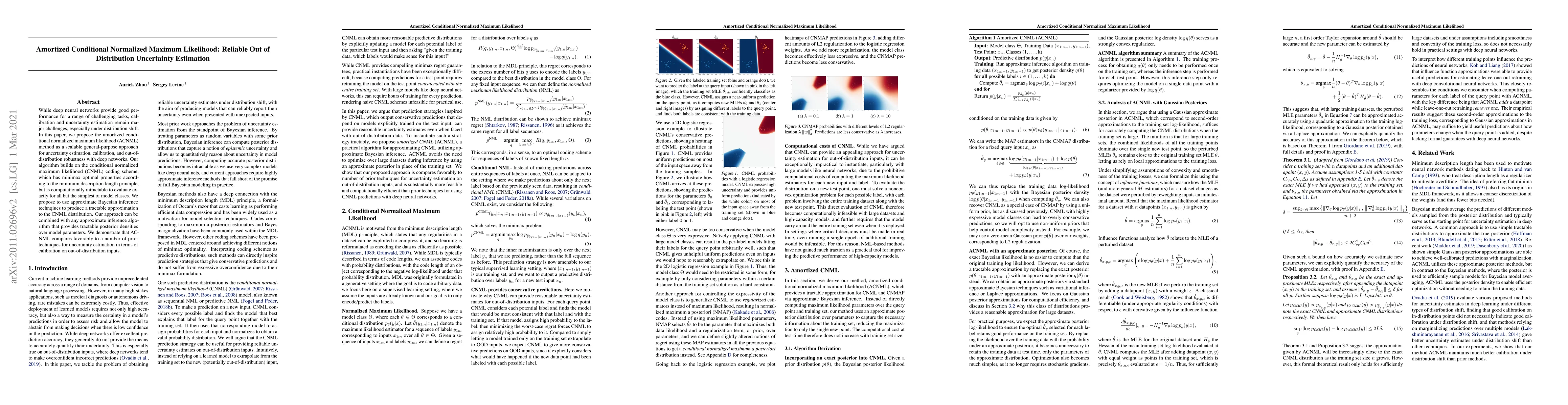 This paper introduces the amortized conditional normalized maximum likelihood (ACNML) method for scalable, general-purpose uncertainty estimation and calibration in deep neural networks, especially under distribution shift. The proposed approach approximates the computationally intractable conditional normalized maximum likelihood (CNML) using Bayesian inference techniques and demonstrates superior calibration on out-of-distribution data compared to prior methods.