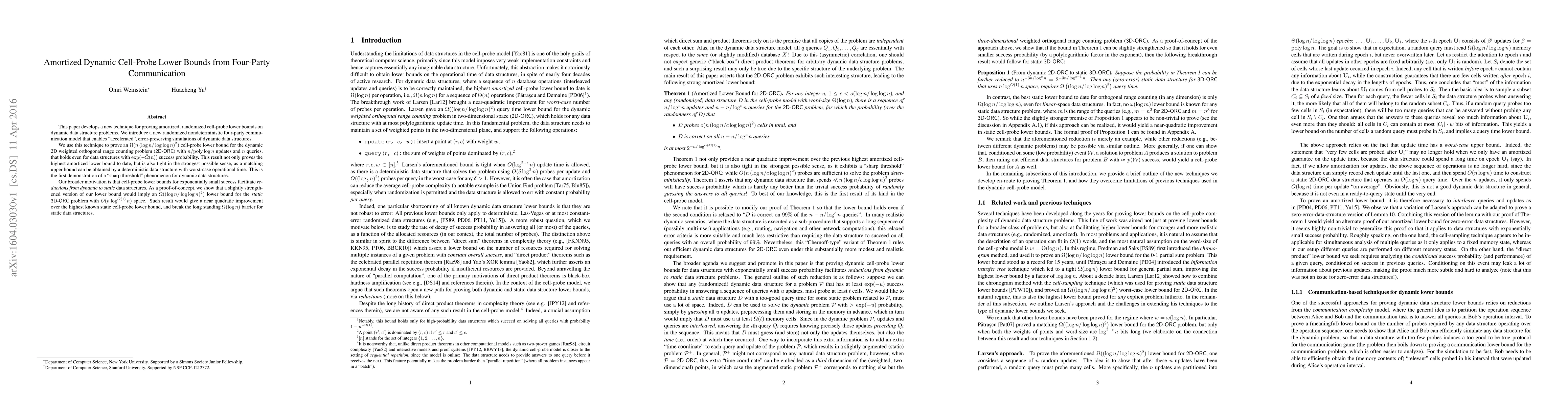 This paper develops a new technique for proving amortized, randomized cell-probe lower bounds on dynamic data structure problems. We introduce a new randomized nondeterministic four-party communication model that enables "accelerated", error-preserving simulations of dynamic data structures. We use this technique to prove an $\Omega(n(\log n/\log\log n)^2)$ cell-probe lower bound for the dynamic 2D weighted orthogonal range counting problem (2D-ORC) with $n/\mathrm{poly}\log n$ updates and $n$ queries, that holds even for data structures with $\exp(-\tilde{\Omega}(n))$ success probability. This result not only proves the highest amortized lower bound to date, but is also tight in the strongest possible sense, as a matching upper bound can be obtained by a deterministic data structure with worst-case operational time. This is the first demonstration of a "sharp threshold" phenomenon for dynamic data structures. Our broader motivation is that cell-probe lower bounds for exponentially small success facilitate reductions from dynamic to static data structures. As a proof-of-concept, we show that a slightly strengthened version of our lower bound would imply an $\Omega((\log n /\log\log n)^2)$ lower bound for the static 3D-ORC problem with $O(n\log^{O(1)}n)$ space. Such result would give a near quadratic improvement over the highest known static cell-probe lower bound, and break the long standing $\Omega(\log n)$ barrier for static data structures.