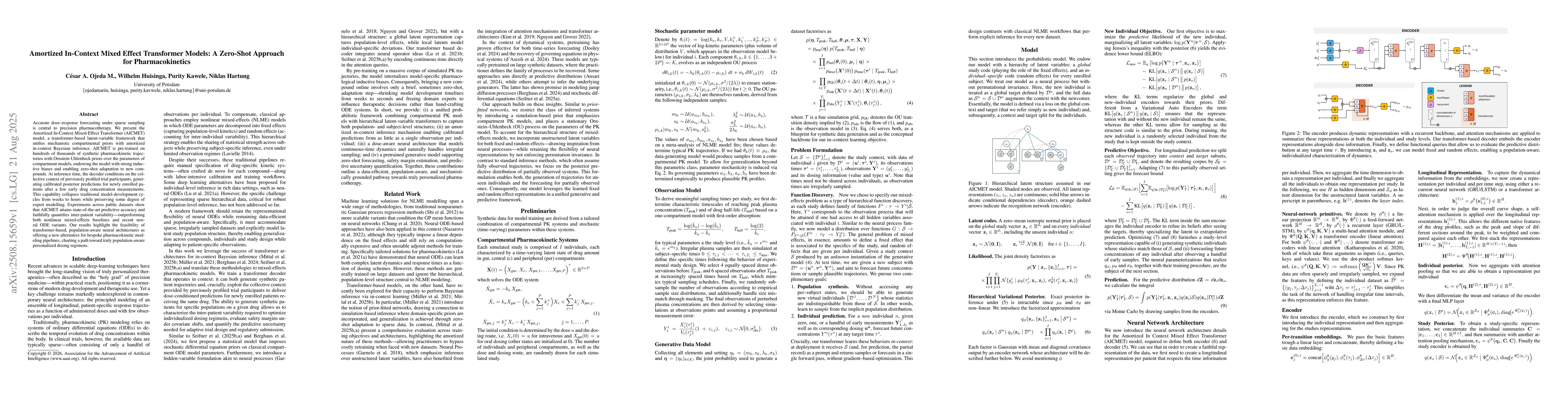 Accurate dose-response forecasting under sparse sampling is central to precision pharmacotherapy. We present the Amortized In-Context Mixed-Effect Transformer (AICMET) model, a transformer-based latent-variable framework that unifies mechanistic compartmental priors with amortized in-context Bayesian inference. AICMET is pre-trained on hundreds of thousands of synthetic pharmacokinetic trajectories with Ornstein-Uhlenbeck priors over the parameters of compartment models, endowing the model with strong inductive biases and enabling zero-shot adaptation to new compounds. At inference time, the decoder conditions on the collective context of previously profiled trial participants, generating calibrated posterior predictions for newly enrolled patients after a few early drug concentration measurements. This capability collapses traditional model-development cycles from weeks to hours while preserving some degree of expert modelling. Experiments across public datasets show that AICMET attains state-of-the-art predictive accuracy and faithfully quantifies inter-patient variability -- outperforming both nonlinear mixed-effects baselines and recent neural ODE variants. Our results highlight the feasibility of transformer-based, population-aware neural architectures as offering a new alternative for bespoke pharmacokinetic modeling pipelines, charting a path toward truly population-aware personalized dosing regimens.