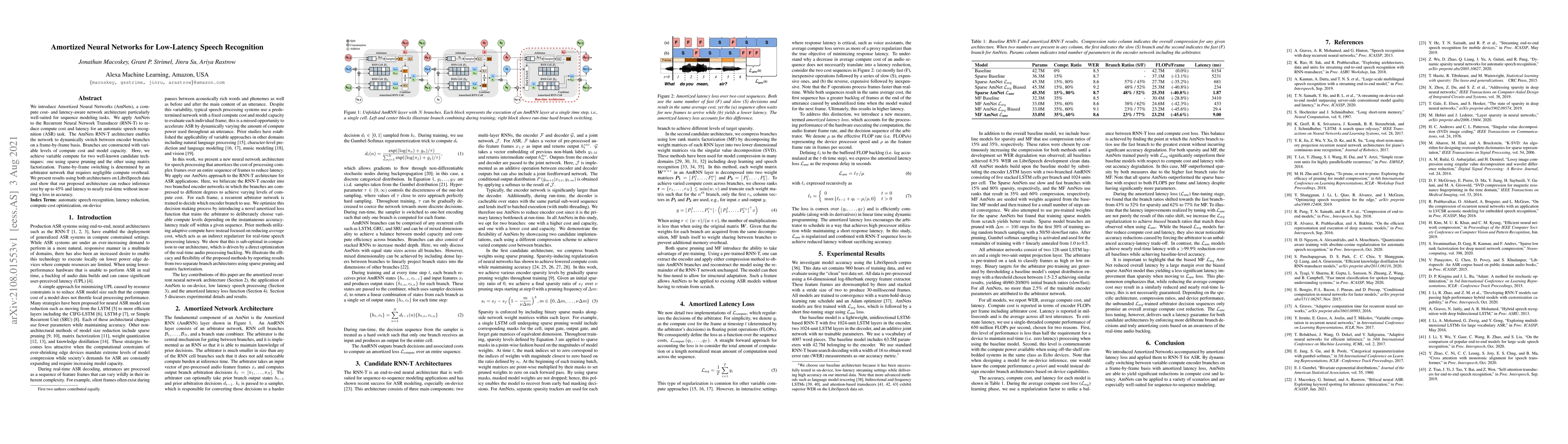 We introduce Amortized Neural Networks (AmNets), a compute cost- and latency-aware network architecture particularly well-suited for sequence modeling tasks. We apply AmNets to the Recurrent Neural Network Transducer (RNN-T) to reduce compute cost and latency for an automatic speech recognition (ASR) task. The AmNets RNN-T architecture enables the network to dynamically switch between encoder branches on a frame-by-frame basis. Branches are constructed with variable levels of compute cost and model capacity. Here, we achieve variable compute for two well-known candidate techniques: one using sparse pruning and the other using matrix factorization. Frame-by-frame switching is determined by an arbitrator network that requires negligible compute overhead. We present results using both architectures on LibriSpeech data and show that our proposed architecture can reduce inference cost by up to 45\% and latency to nearly real-time without incurring a loss in accuracy.