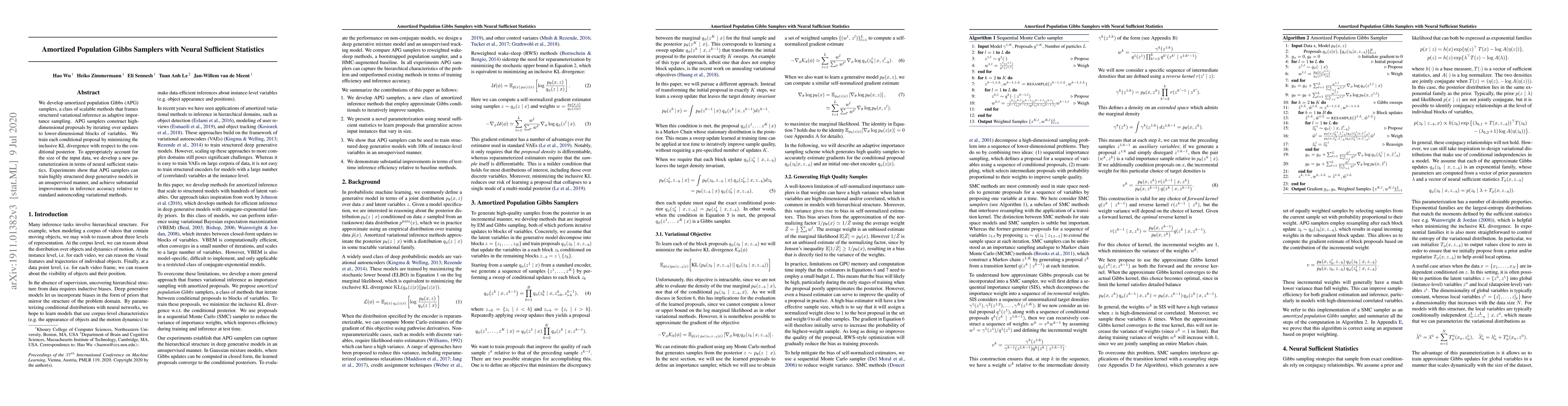 This paper introduces amortized population Gibbs (APG) samplers, scalable methods for structured variational inference framed as adaptive importance sampling. These samplers leverage neural sufficient statistics to train deep generative models unsupervised, achieving better inference accuracy compared to standard autoencoding variational methods.