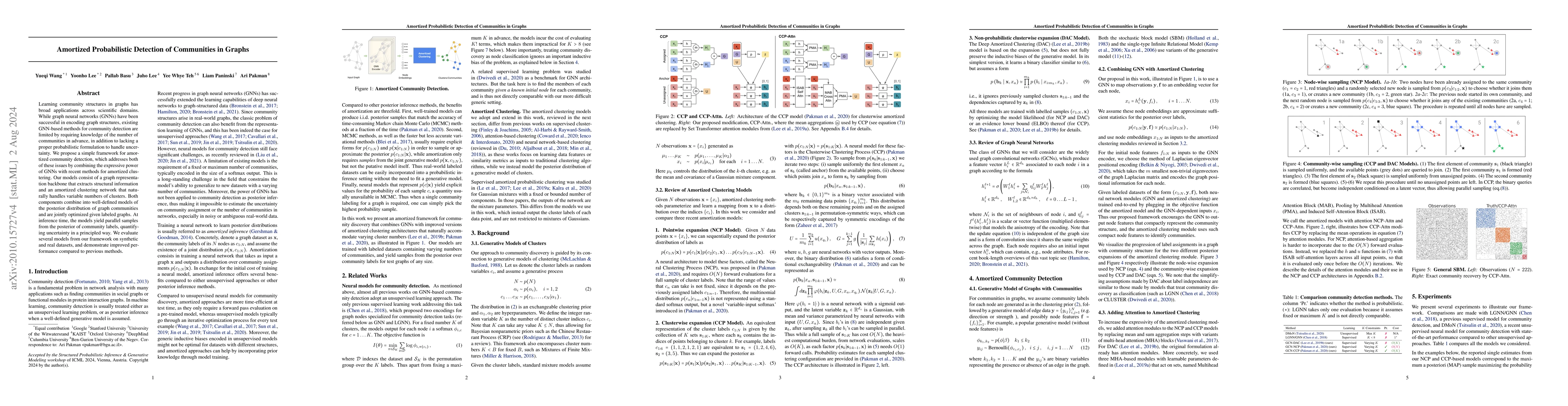 This paper proposes a framework for amortized probabilistic community detection in graphs, combining GNNs with amortized clustering to handle variable community numbers without prior knowledge and to manage uncertainty. The approach yields probabilistic community labels and outperforms previous methods on both synthetic and real datasets.