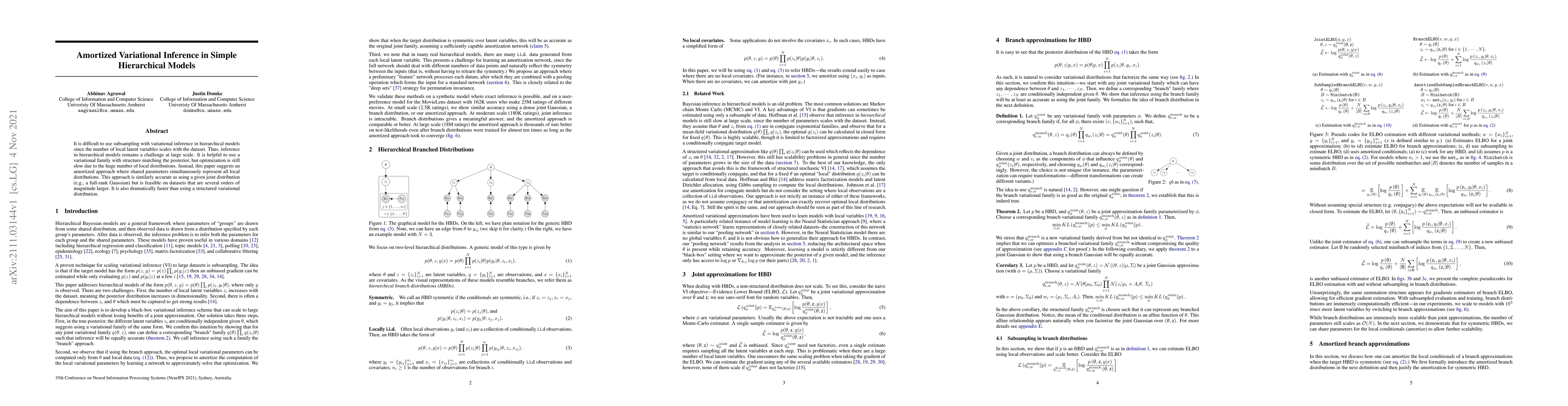 This paper proposes an amortized variational inference method for large-scale hierarchical models, where shared parameters represent all local distributions, achieving similar accuracy to traditional methods but at a much faster computational speed. This approach is feasible for datasets several orders of magnitude larger than previously possible.