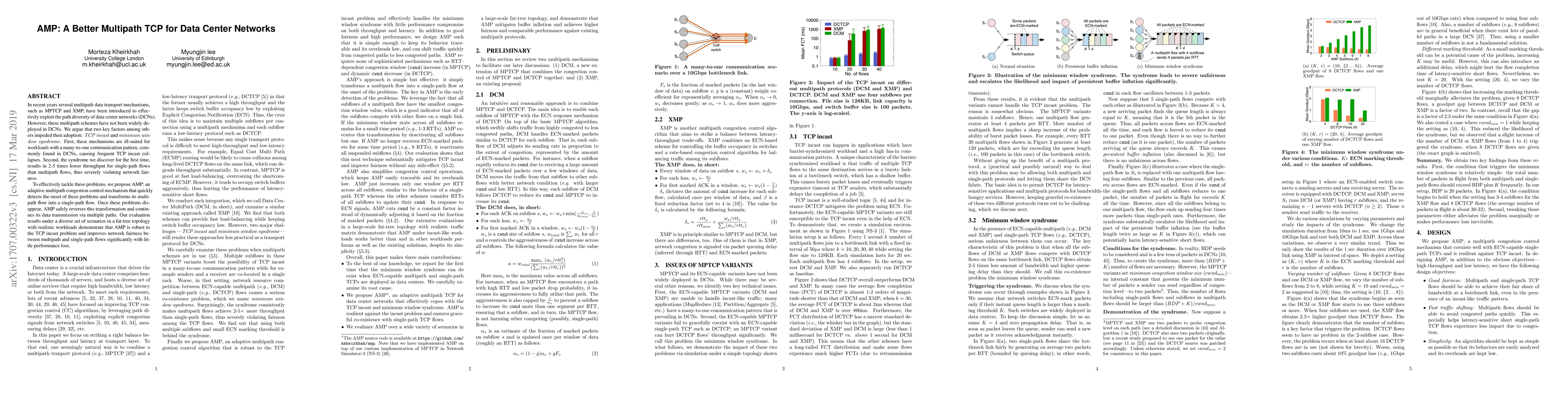 The paper proposes AMP, an adaptive multipath congestion control mechanism to address TCP incast and minimum window syndrome in data center networks, improving fairness and performance for multipath and single-path flows. Evaluations show AMP effectively tackles these issues with minimal performance loss.
