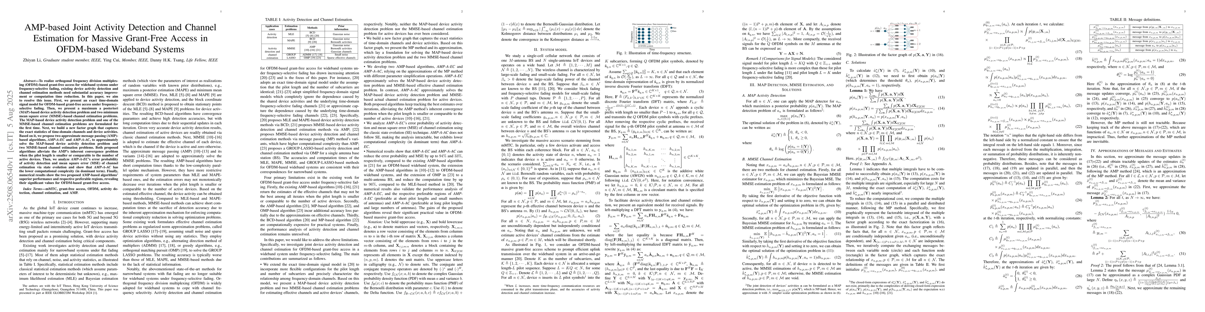 To realize orthogonal frequency division multiplexing (OFDM)-based grant-free access for wideband systems under frequency-selective fading, existing device activity detection and channel estimation methods need substantial accuracy improvement or computation time reduction. In this paper, we aim to resolve this issue. First, we present an exact time-domain signal model for OFDM-based grant-free access under frequency-selective fading. Then, we present a maximum a posteriori (MAP)-based device activity detection problem and two minimum mean square error (MMSE)-based channel estimation problems. The MAP-based device activity detection problem and one of the MMSE-based channel estimation problems are formulated for the first time. Next, we build a new factor graph that captures the exact statistics of time-domain channels and device activities. Based on it, we propose two approximate message passing (AMP)-based algorithms, AMP-A-EC and AMP-A-AC, to approximately solve the MAP-based device activity detection problem and two MMSE-based channel estimation problems. Both proposed algorithms alleviate the AMP's inherent convergence problem when the pilot length is smaller or comparable to the number of active devices. Then, we analyze AMP-A-EC's error probability of activity detection and mean square error (MSE) of channel estimation via state evolution and show that AMP-A-AC has the lower computational complexity (in dominant term). Finally, numerical results show the two proposed AMP-based algorithms' superior performance and respective preferable regions, revealing their significant values for OFDM-based grant-free access.