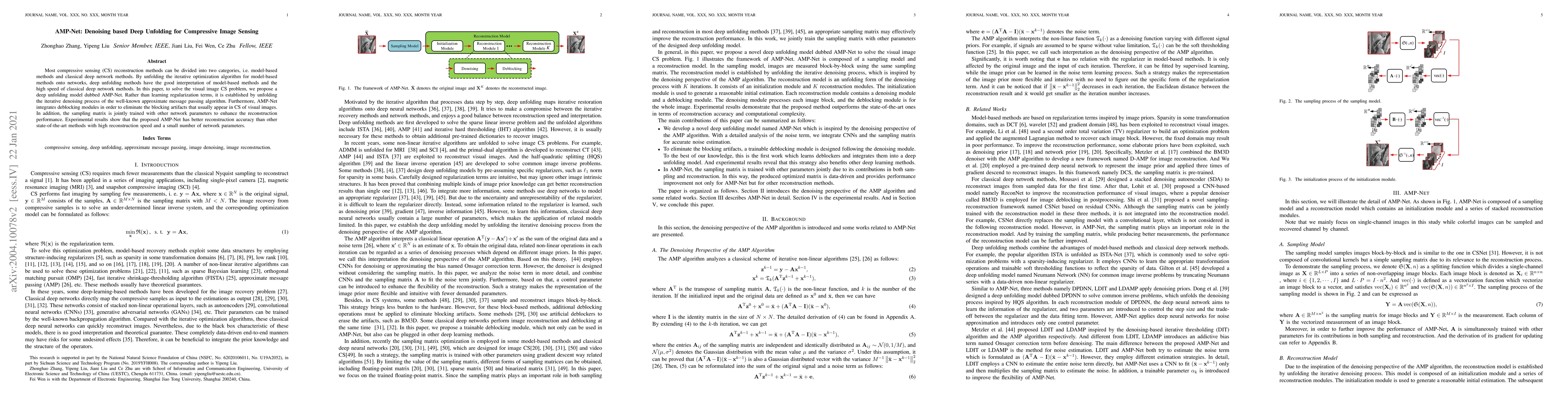 AMP-Net is a deep unfolding model for compressive image sensing that unfolds the iterative denoising process of the approximate message passing algorithm, integrating deblocking modules to eliminate artifacts. The model jointly trains the sampling matrix to improve reconstruction accuracy, achieving superior performance compared to other methods.