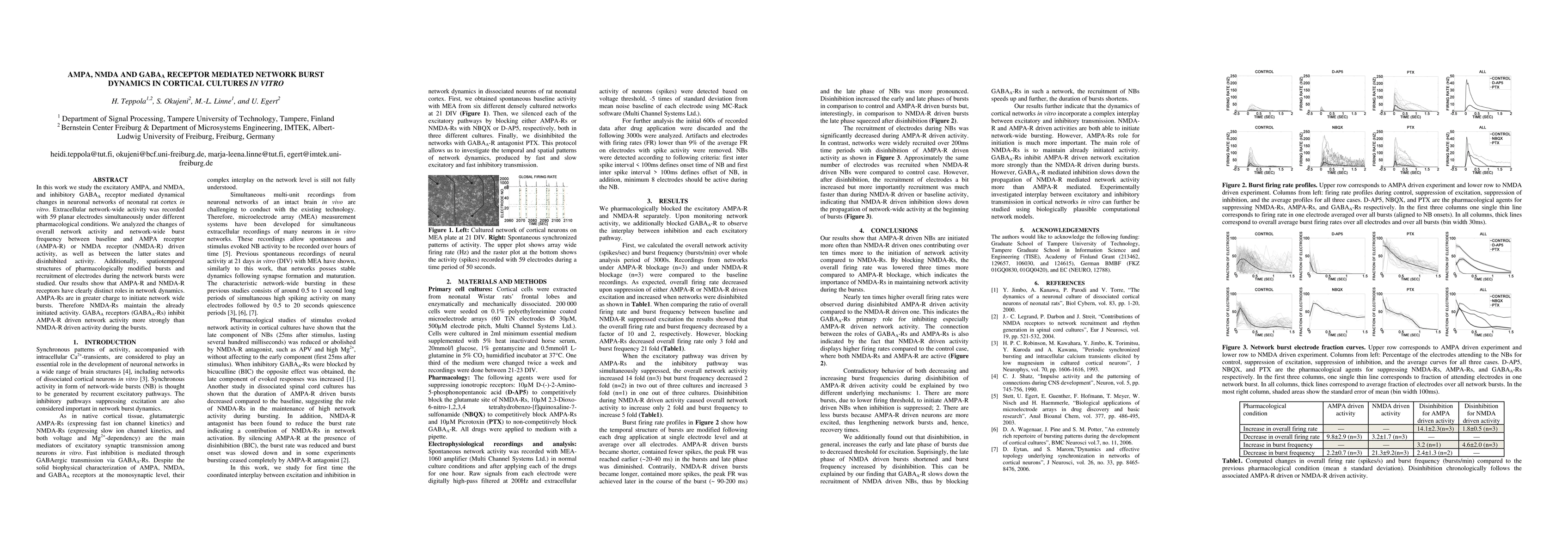 This study investigates the roles of AMPA, NMDA, and GABAA receptors in the dynamics of neuronal networks in neonatal rat cortical cultures. Results indicate that AMPA receptors primarily initiate network bursts, while NMDA receptors sustain them, and GABAA receptors more strongly inhibit AMPA-driven activity compared to NMDA-driven activity.