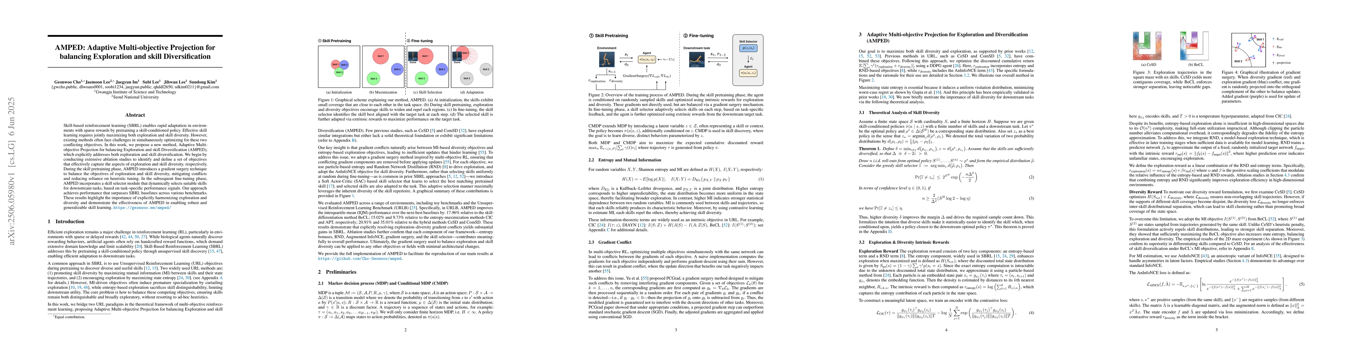 AMPED introduces an adaptive multi-objective projection approach with gradient surgery for balancing exploration and skill diversity, along with a skill selector module for dynamic skill selection.