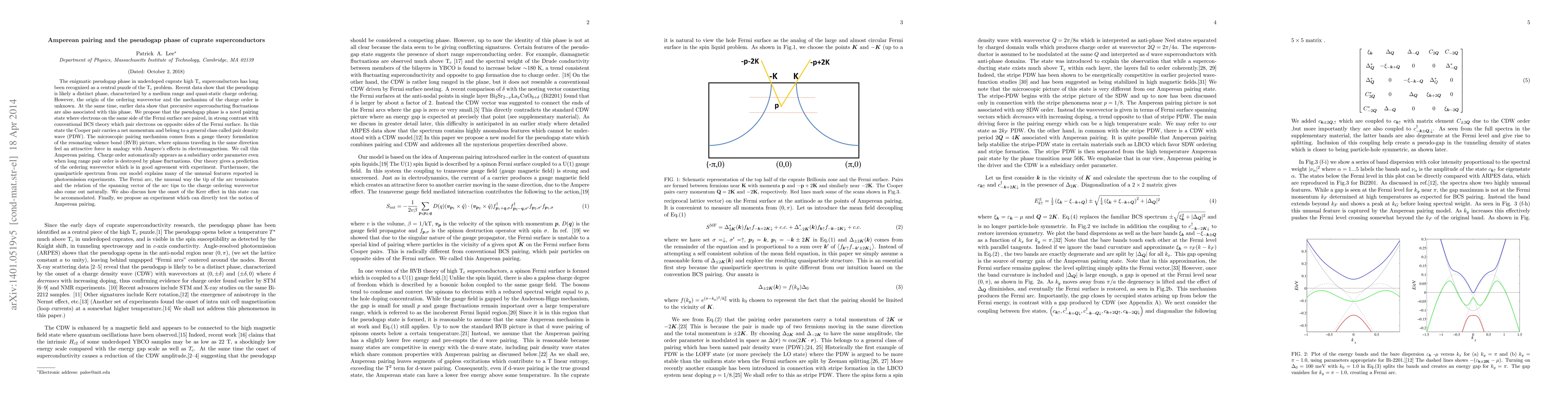 This paper proposes a novel pairing mechanism called Amperean pairing in the pseudogap phase of cuprate superconductors, where electrons on the same side of the Fermi surface pair, forming a pair density wave. This mechanism, derived from a gauge theory of the resonating valence bond picture, predicts a charge order wavevector consistent with experimental data and explains various photoemission observations.