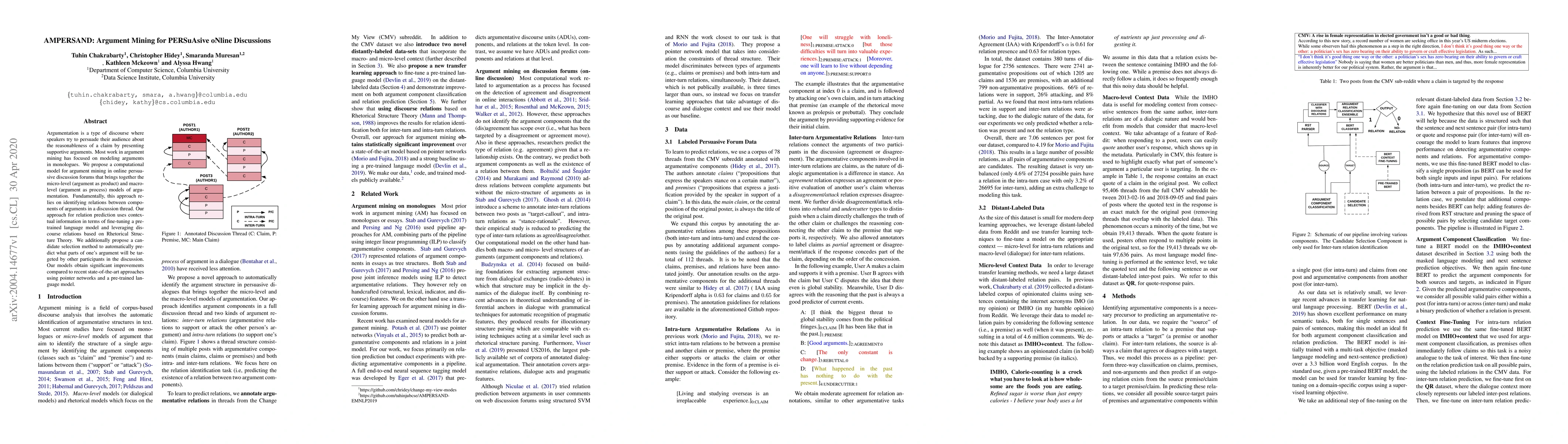 The AMPERSAND model proposes a computational framework for mining arguments in online persuasive discussions, integrating both micro-level and macro-level argumentation models. It leverages contextual information and fine-tuned language models to predict argument relations and anticipates counterarguments, outperforming existing state-of-the-art methods.