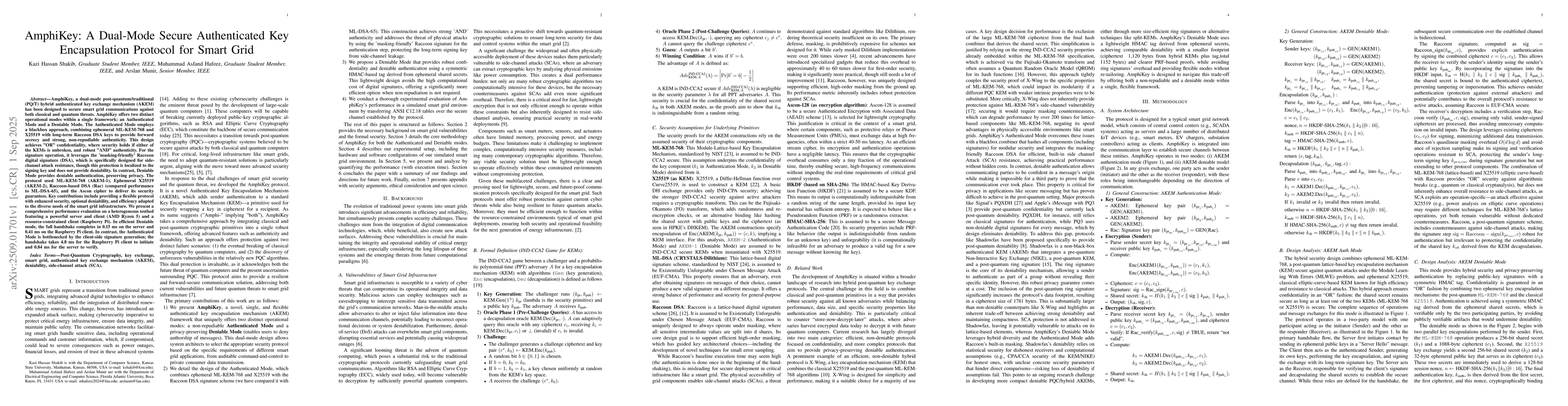 AmphiKey, a dual-mode post-quantum/traditional (PQ/T) hybrid authenticated key exchange mechanism (AKEM) has been designed to secure smart grid communications against both classical and quantum threats. AmphiKey offers two distinct operational modes within a single framework: an Authenticated Mode and a Deniable Mode. The Authenticated Mode employs a blackbox approach, combining ephemeral ML-KEM-768 and X25519 with long-term Raccoon DSA keys to provide forward secrecy and strong, non-repudiable authenticity. This design achieves "OR" confidentiality, where security holds if either of the KEMs is unbroken, and robust "AND" authenticity. For the signature operation, it leverages the 'masking-friendly' Raccoon digital signature (DSA), which is specifically designed for side-channel attack resistance, though this protection is localized to the signing key and does not provide deniability. In contrast, Deniable Mode provides deniable authentication, preserving privacy. The protocol used ML-KEM-768 (AKEM-1), Ephemeral X25519 (AKEM-2), Raccoon-based DSA (Rac) (compared performance to ML-DSA-65), and the Ascon cipher to deliver its security guarantees. Key contributions include providing a flexible protocol with enhanced security, optional deniability, and efficiency adapted to the diverse needs of the smart grid infrastructure. We present a comprehensive performance evaluation on a heterogeneous testbed featuring a powerful server and client (AMD Ryzen 5) and a resource-constrained client (Raspberry Pi). In efficient Deniable mode, the full handshake completes in 0.15 ms on the server and 0.41 ms on the Raspberry Pi client. In contrast, the Authenticated Mode is bottlenecked by the client-side signature generation; the handshake takes 4.8 ms for the Raspberry Pi client to initiate and 0.84 ms for the server to verify.