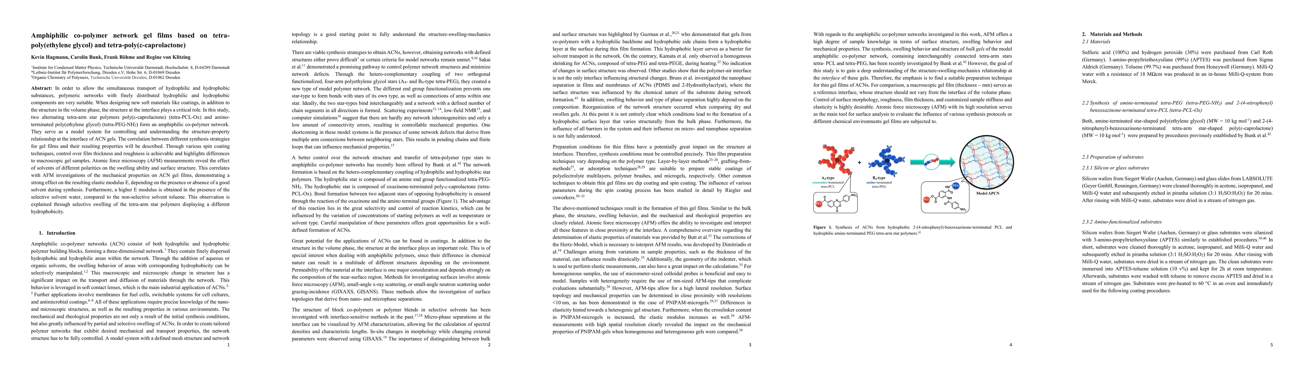 This study investigates amphiphilic co-polymer network gel films formed from tetra-arm star polymers of poly(ε-caprolactone) and amino-terminated poly(ethylene glycol). The research highlights the influence of synthesis strategies and solvent polarity on the gel films' properties, including thickness, roughness, and elastic modulus, as determined through spin coating and AFM analysis.