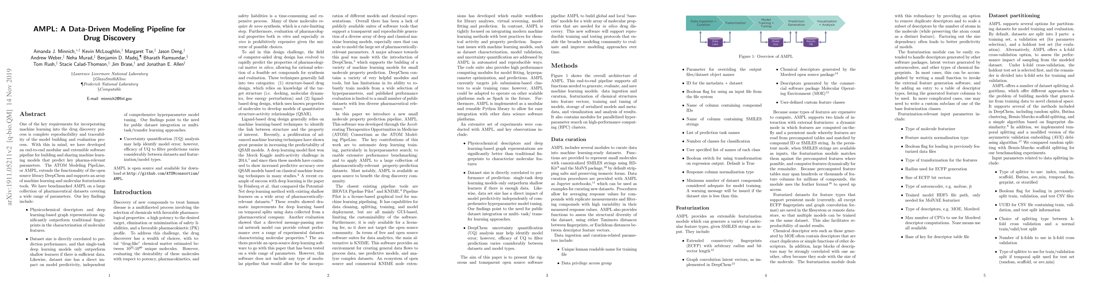 One of the key requirements for incorporating machine learning into the drug discovery process is complete reproducibility and traceability of the model building and evaluation process. With this in mind, we have developed an end-to-end modular and extensible software pipeline for building and sharing machine learning models that predict key pharma-relevant parameters. The ATOM Modeling PipeLine, or AMPL, extends the functionality of the open source library DeepChem and supports an array of machine learning and molecular featurization tools. We have benchmarked AMPL on a large collection of pharmaceutical datasets covering a wide range of parameters. As a result of these comprehensive experiments, we have found that physicochemical descriptors and deep learning-based graph representations significantly outperform traditional fingerprints in the characterization of molecular features. We have also found that dataset size is directly correlated to prediction performance, and that single-task deep learning models only outperform shallow learners if there is sufficient data. Likewise, dataset size has a direct impact on model predictivity, independent of comprehensive hyperparameter model tuning. Our findings point to the need for public dataset integration or multi-task/transfer learning approaches. Lastly, we found that uncertainty quantification (UQ) analysis may help identify model error; however, efficacy of UQ to filter predictions varies considerably between datasets and featurization/model types. AMPL is open source and available for download at http://github.com/ATOMconsortium/AMPL.