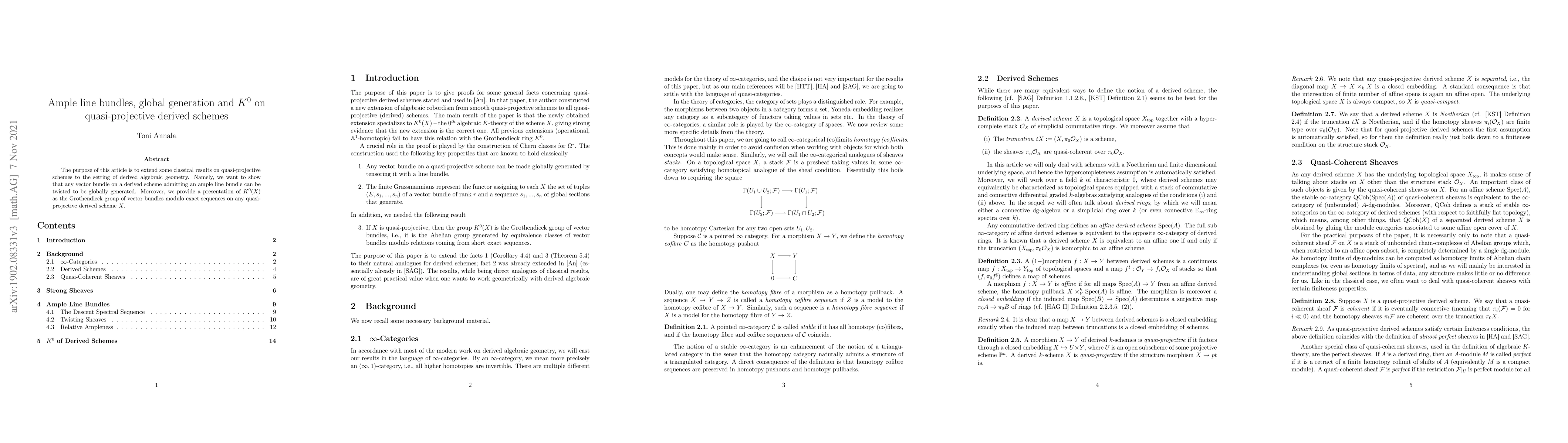 This paper extends classical results on quasi-projective schemes to derived algebraic geometry, proving that vector bundles on derived schemes with ample line bundles can be globally generated upon twisting. It also presents $K_0(X)$ as the Grothendieck group of vector bundles on any quasi-projective derived scheme $X$.